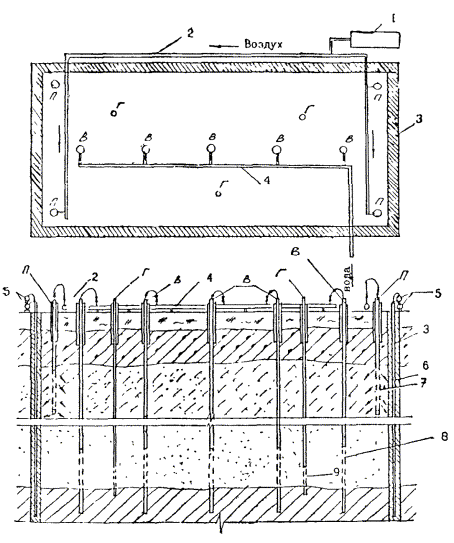 Рис. П.26.1: П - воздухоподающие скважины; В - водопонижающие скважины, оборудованные глубинными насосами; Г - наблюдательные скважины; 1 - компрессорная станция; 2 - магистраль сжатого воздуха; 3 - ледопородное ограждение; 4 - общий сливной трубопровод; 5 - рассольные коллекторы; 6 - замораживающая колонна; 7 - фильтровое звено воздухоподающей скважины; 8 - фильтровое звено водопонизительной скважины; 9 - фильтровое звено наблюдательной скважины Приложение 27