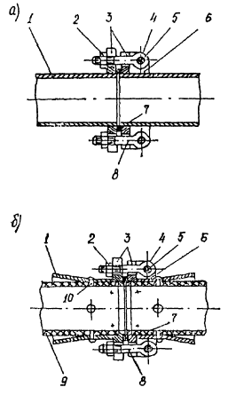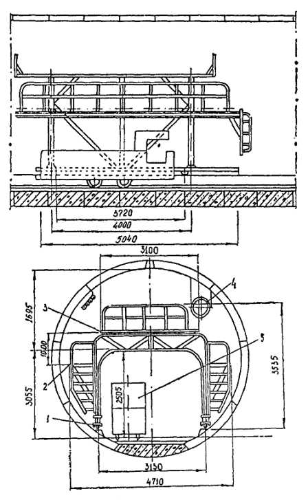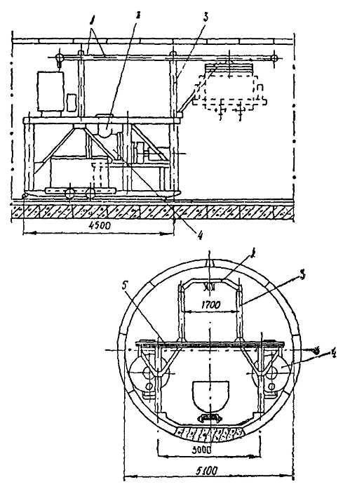 * Растворонасос СО-10 может оснащаться приставкой Марчукова прямого действия, позволяющей нагнетать малоподвижные растворы. ** Насосная установка СО-200 в комплексе со смесителем СО-201 (СО-211) позволяет осуществить непрерывное приготовление и нагнетание раствора. Приложение 9Технологические тележки для нагнетания раствора в перегонных тоннеляхСхема технологической тележки ТН 16 Гп для первичного нагнетания раствора представлена на рис. П.9.1. Рис. п.9.1. Схема технологической тележки для нагнетания раствора: 1 - балка для подвески тельфера; 2 - загрузочный люк; 3 - рама для монорельса; 4 - растворонагнетатели; 4 - рама тележки Рис. П.9.2. Схема технологической тележки для контрольного нагнетания: 1 - ходовая часть; 2 - боковые площадки; 3 - верхняя площадка; 4 - вентиляционный трубопровод; 5 - электровоз Техническая характеристика Тележка предназначена для работы в тоннеле диаметром, мм .................. 5100 Тележка оснащена двумя растворонагнетателями РН-1, м3 ...............…… 0,235 Грузоподъемность, т ............. ………………………………………………..3,2 Установленная мощность, кВт ........……………………………………….. 18 База, м ..................…………………………………………………………… 4,5 Габаритные размеры, мм: длина .............…………………………………………………………… 7800 ширина ................……………………………………………………….. 4600 высота ...............…………………………………………………………. 4700 Масса, т ................……………………………………………………………. 22 Схема инвентарной тележки для контрольного нагнетания представлена на рис. П.9.2. Техническая характеристика Грузоподъемность, т ..........….. 1,0 Колея, мм ..............……………. 3130 База, м ................………………. 3,7 Механизм передвижения .......... ручная лебедка Габаритные размеры, мм: длина ..............…………….. 6200 ширина ..............………….. 4700 высота ...............…………... 3500 Масса, т ...............……………… 3,1 Пневматическая торцевая опалубкаПневматическая торцевая опалубка компонуется из мягких оболочек цилиндрической формы различных диаметров и длины со сферическими или плоскими торцами. Оболочка (Рис. П.10.1) состоит из силовой покрышки, изготовленной из высокопрочной капроновой ткани, и герметичной резиновой камеры со штуцером. К штуцеру присоединен резиновый рукав с запорным вентилем. Схема установки пневматической торцевой опалубки в перегонном тоннеле диаметром 5,5 м конструкции ДГИ представлена на рис. П.10.2. Техническая характеристика Количество оболочек, шт ....... 6 Диаметр оболочки, м ..........… 0,4 Длина, м ..............……………. 2,2 (2) Рабочее давление, Мпа ........... 0,3 - 0,4 Масса оболочки, кг ...........….. 8 То же комплекта, кг..........….. 52 Рис. П.10.1. Конструкция мягкой оболочки: 1 - силовая покрышка; 2 - резиновая камера; 3 - штуцер; 4 - резиновый рукав; 5 - вентиль Рис. П.10.2. Схема установки пневматической торовой опалубки: 1 - сборная обделка; 2 - основная оболочка; 3 - вспомогательная оболочка; 4 - рукав с вентилем В комплект входят вспомогательные оболочки диаметром 0,2 м, длиной 1,2 м, укладываемые на основные (если зазор между обделкой и грунтом превышает 0,4 м). Чтобы не превышать рабочее давление в мягких оболочках, заполнение их сжатым воздухом рекомендуется осуществлять через регулятор типа 112-25 УХЛ-4, устанавливаемый на основной магистрали сжатого воздуха. Приложение 11Торовое устройство