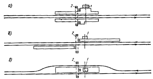 2. При укладке двух встречных стрелочных переводов с направлением боковых путей в одну сторону от прямого пути (см. схему 2) между стыками рамных рельсов должна быть прямая вставка: