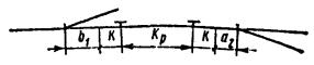 11. Укладку двух стрелочных переводов на приемо-отправочных и прочих путях, когда между ними требуется устройство кривой без возвышения наружного рельса и переходных кривых, следует производить с соблюдением следующих требований: между передними стыками рамных рельсов или торцом крестовины и начала кривой (см. схемы 8 и 9) следует предусматривать прямую вставку K, длина которой должна позволять устройство отвода уширения колеи.