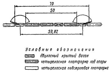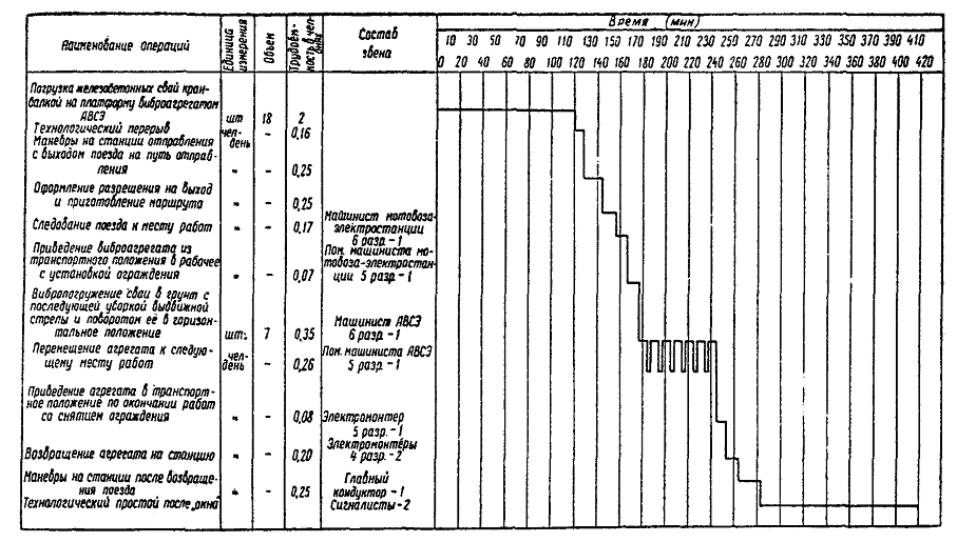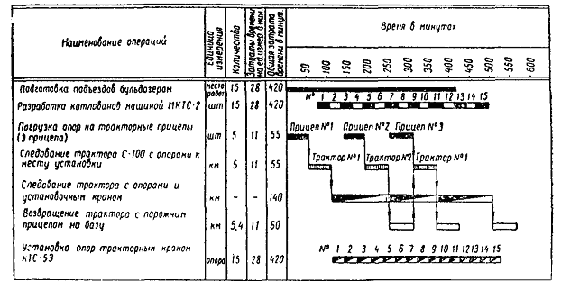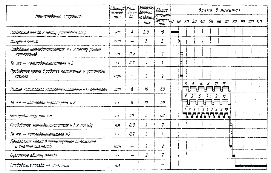 Примечания. 1. В соответствии с § 223 «Инструкции по движению поездов и маневровой работе на железных дорогах СССР» обязанности главного кондуктора могут быть возложены на ответственного руководителя работ. 2. Рабочие, занятые вертикальной регулировкой опор, засыпкой котлованов с уплотнением грунта и установкой анкерных оттяжек, разбиты на 2 звена по 4 чел. в каждом. 2.3.2. На участках с руководящим уклоном не более 8 %о и преобладанием прямых для установки опор рекомендуется следующий комплект механизмов: 4 - 6 котлованокопателей (буровые машины и многоковшовые котлованокопатели) и 1 установочный поезд (рис. 3) в составе локомотива (тепловоза), подстреловой платформы, крана МК-15 (КМ-16), платформы с опорами, двухосного крытого вагона-теплушки, четырехосной платформы с лежнями и опорными плитами, второй платформы с опорами, второго крана МК-15 (КМ-16) с подстреловой платформой. Комплексная бригада в этом случае состоит из 42 чел. (табл. 2). 2.3.3. Сооружение опор контактной сети комплектом механизмов, работающих «с пути» в «окно», следует осуществлять таким образом, чтобы вслед за механизированной разработкой котлованов в это же «окно» проводилась установка опор. Разрыв во времени между окончанием разработки котлованов и установкой в них опор должен быть не более суток. Количество заблаговременно отрытых котлованов должно быть таким, чтобы обеспечить бесперебойную работу установочного поезда в следующие сутки и должно составлять 50 % производительности установочного поезда в одно «окно». Рис. 3. Схема установочного поезда 2.3.5. Механизированную разработку котлованов и установку опор с железнодорожного пути рекомендуется осуществлять в светлое время суток. Установочный поезд необходимо отправлять на перегон сцепленным с двумя - тремя механизмами для разработки котлованов под единым руководством. После прибытия на место котлованокопатель и буровую машину отцепляют от установочного поезда и они приступают к разработке котлованов, а установочный поезд устанавливает опоры в котлованы, вырытые механизмами в предыдущее «окно». Работа комплекта механизмов для сооружения опор контактной сети «с пути» должна выполняться согласно технологическому графику (рис. 4), разрабатываемому с учетом конкретных местных условий (длина перегона, группа грунтов и др.). Таблица 2 Состав комплексной бригады для сооружения опор «с пути» с одновременной работой двух кранов