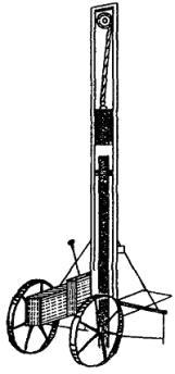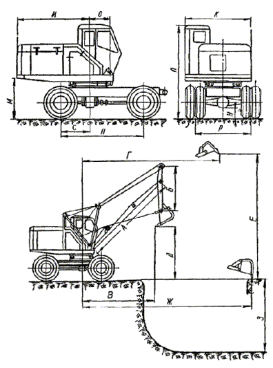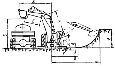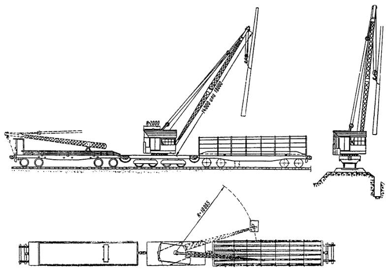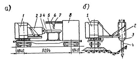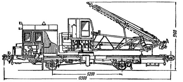 Скорость подъема наибольшего груза....................................... от 0,1 до 10 м/мин Скорость вращения поворотной части..................................... от 0,5 до 2,8 об/мин Скорость передвижения без груза....................................................... 15 км/ч Наибольшая скорость передвижения крана самоходом.................. 14,7 км/ч Характеристика двигателя: СМД-14 четырехтактный, тип........................................................................................... бескомпрессорный число цилиндров................................................................................... 4 мощность............................................................................................ 75 л.с. число оборотов в минуту................................................................... 1700 Габаритные размеры крана: длина в транспортном положении со стрелой длиной 10 м...... 14000 мм высота в транспортном положении................................................ 3885 » наибольшая ширина крана............................................................... 3150 » ширина колеи колес.......................................................................... 2400 » Вес крана со стрелой 10 м.............................................................. 23300 кг Рис. 12. Диаграмма грузоподъемности и схема крана К-161 11. Вертикальный многоковшовый котлованокопатель ВК (рис. 13) Рис. 13. Вертикальный многоковшовый котлованокопатель Техническая характеристика котлованокопателя Мощность двигателя дрезины............................................................... 90 л.с. Скорость передвижения: на первой передаче.......................................................................... 9,5 км/ч на второй передаче............................................................................ 17,9 » на третьей передаче.......................................................................... 31,2 » на четвертой передаче...................................................................... 59,4 » Длина базы машины............................................................................. 5200 мм Вес машины............................................................................................ 18,1 т Производительность в час............................................................... 6 котлованов Вылет рабочего органа от оси пути: наибольший...................................................................................... 6000 мм наименьший....................................................................................... 2700 » Число ковшей.......................................................................................... 20 шт. Емкость одного ковша............................................................................. 20 л Шаг ковшей............................................................................................ 600 мм Скорость движения ковшей............................................................... 0,61 м/сек Скорость движения ленты транспортера............................................... 4 » Скорость подачи рабочего орган....................................................... 0,5 м/сек Размеры отрываемых котлованов: в плане........................................................................................... 660´900 мм глубина.............................................................................................. до 4,6 м 12. Буровая машина (рис. 14) Рис. 14. Буровая машина Техническая характеристика буровой машины Мощность двигателя дрезины............................................................... 93 л.с. Мощность двигателя бурового агрегата................................................. 54 » Максимальная скорость передвижения по перегону........................ 60 км/ч Производительность в час............................................................ 6 - 8 котлованов Вылет рабочего органа: наименьший........................................................................................ 2,7 м наибольший......................................................................................... 5,5 » Максимальная глубина отрываемого котлована от уровня головки рельса......................................................................................... 4,4 м То же с перестановкой гайки................................................................. 4,8 м Диаметр отрываемых котлованов........................................... 500; 600; 700 и 800 мм Вес машины.............................................................................................. 18 т Бу
