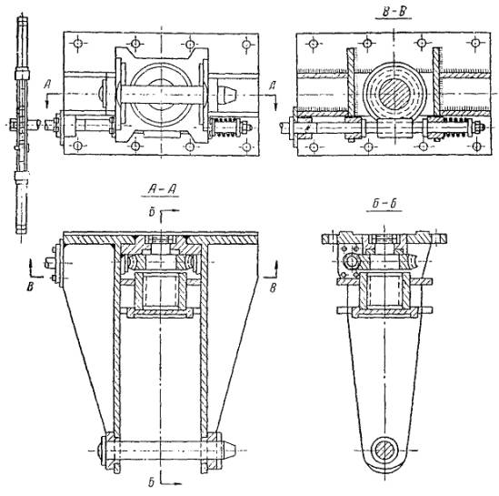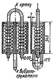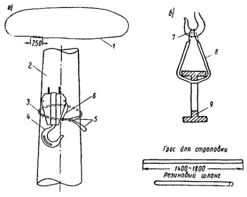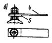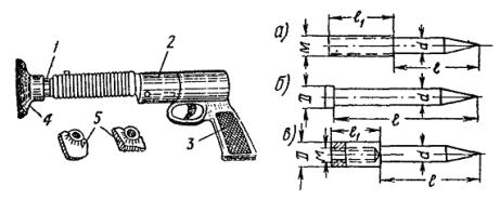 Рис. 10. Секционные изоляторы: а - переменного тока; б - трехпроводный секционный изолятор Приложение 11МЕХАНИЗМЫ И ПРИБОРЫ, ПРИМЕНЯЕМЫЕ ПРИ МОНТАЖЕ ОБОРУДОВАНИЯ ТЯГОВЫХ ПОДСТАНЦИЙ1. Станок для забивки электродов заземления Станок (рис. 1) состоит из тележки с площадкой, на которой расположены электродвигатель, редуктор и лебедка направляющих стоек из стальных труб. По направляющим скользит ударник (чугунная болванка весом 55 кг) верхнего барабана. На одном валу с редуктором установлен наматывающий барабан. После установки станка над местом заглубления электрода, подсоединения электродвигателя к источнику питания и установки электрода в зажиме станка двигатель включают в работу и при помощи рычага включают подъемное устройство. Ремень с закрепленным на нем ударником наматывают на нижний барабан, а через верхний барабан ударник поднимают вверх. После включения сцепления болванка, падая вниз, ударяет по верхней части электрода. Операцию повторяют до погружения электрода в грунт на требуемую глубину. Для забивки одного электрода в грунт третьей категории требуется около 10 мин. Станок легко разбирается для перевозки вдоль траншеи. Управляет им один рабочий. 2. Крепление деталей и конструкций с помощью строительно-монтажного пистолета и дюбелей Строительно-монтажный пистолет типа СМП-1 служит для забивки специальных крепежных деталей (дюбелей) в различные строительные основания - бетон, железобетон, кирпич, сталь. Его применение позволяет в 4 - 5 раз ускорить выполнение креплений электроконструкций. Пистолет состоит (рис. 2) из ствола с муфтой, корпуса с размещенным в нем ударно-спусковым механизмом и защелкой запирания, устройства ступенчатой блокировки безопасности кожуха с резиновой ручкой и предохранительной пробкой, сменных защитных наконечников, предохраняющих рабочих от осколков, и рукоятки. Сменные наконечники обычно имеют круглую форму, но в некоторых случаях такая форма затрудняет забивку дюбелей в требуемом месте, поэтому в наборе имеются 2 фасонных защитных наконечника. Пистолет снабжен двумя сменными стволами диаметром 3 и 12 мм, каждый из которых применяют в зависимости от размеров забиваемых крепежных деталей. Применяются дюбеля трех типов: а) с наружной резьбой; б) гвоздеобразный; в) с внутренней резьбой. Дюбеля с наружной или внутренней резьбой забивают в кирпичные и бетонные стены или в стальные конструкции, после чего к ним крепят детали оборудования. В случае, если монтируемое изделие во время эксплуатации снимать не требуется, то оно закрепляется гвоздеобразными дюбелями. Рис. 1. Станок для забивки электродов В зависимости от назначения и веса закрепляемой детали, способа крепления и материала конструкции выпускаются дюбеля различных типов (табл. 1) и размеров. К пистолету выпускаются патроны диаметром 12,5 мм, двенадцати типоразмеров: 3 группы В длиной 17,5 мм и 4 группы Г длиной 24 мм (табл. 2). Патроны выбираются в зависимости от размеров забиваемых дюбелей и материала конструкции, в которую их забивают. Рис. 2. Строительно-монтажный пистолет: а - дюбель с наружной резьбой; б - гвоздеобразный дюбель; в - дюбель с внутренней резьбой; 1 - ударный механизм; 2 - ствол; 3 - рукоятка; 4 - наконечник; 5 - сменные наконечники; l1 - длина резьбы; l - часть дюбеля без резьбы; d - диаметр дюбеля; D - диаметр головки; М - метрическая резьба Т