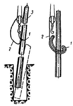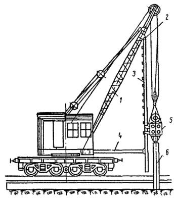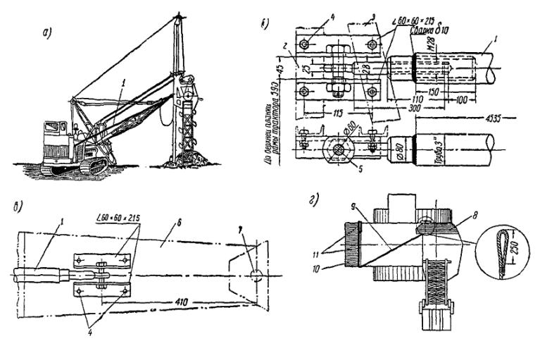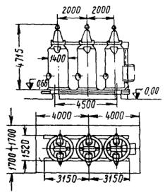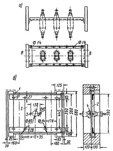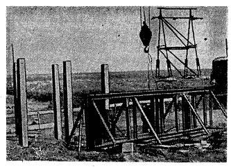 * В состав бригады не входит. А. Сооружение конструкций открытой части тяговой подстанции 3.4.2. На открытой части тяговой подстанции сооружаются: опоры под оборудование, состоящие из рамно-ригельных конструкций и свай-стоек с прикрепленными к ним ригелями или без ригелей; порталы (и отдельно стоящие опоры) - из типовых железобетонных консольных опор контактной сети, устанавливаемых на фундаменты типа «ДС»; наземные кабельные каналы из отдельных железобетонных коробов; фундаменты под понизительные трансформаторы и т.д. 3.4.3. Опоры под оборудование, состоящие из свай-стоек, рекомендуется сооружать методом вибропогружения с применением буровой машины БКГМ, крана КТС-5Э, вибропогружателя ВП-2, металлического кондуктора, наголовника, трубы для образования скважин и амортизатора. Энергию для питания вибропогружателя, а также других машин, используемых при строительстве (при отсутствии возможностей получения энергии от существующих сетей), получают от электростанции мощностью 50 - 60 квт. Работы по вибропогружению, а именно - установка металлического кондуктора, погружение трубы и свай-стоек в грунт, перестановка кондуктора на новое место, выполняются бригадой из 4 чел.: машиниста крана КТС-5Э и трех монтажников (такелажников). 3.4.4. Погружение свай-стоек необходимо выполнять в следующем порядке. На площадку предварительно завозят до 50 % свай-стоек, которые разгружают в заранее намеченных местах (с учетом зоны действия и беспрепятственного прохода крана). Стойки следует раскладывать так, чтобы оси имеющихся в них отверстий располагались параллельно поверхности строительной площадки. Соблюдение этого условия позволит в последующем надевать наголовник на сваи-стойки без их раскантовки. Места погружения свай-стоек определяют с помощью теодолита и закрепляют колышками. С помощью буровой машины или полой трубы образовывают скважины, необходимые для повышения точности и сокращения времени погружения свай, предохранения их от трещин и сколов, определения, нет ли в грунте валунов и других включений, а также повышения производительности вибропогружателя. Рис. 31. Кондуктор для погружения свай-стоек открытой части тяговой подстанции Буровой машиной БКГМ бурят скважины диаметром 20 см и глубиной 2 м, а для свай, погружаемых на глубину более 2 м, скважины образовывают путем вибропогружения в грунт полой трубы длиной 5 м. В стенках трубы вырезают окна шириной 0,2 длины окружности, длиной до 1,5 м, для того, чтобы облегчить извлечение грунта из трубы; окна располагают друг против друга, а по длине трубы - в шахматном порядке. Рис. 32. Наголовник Трубу с грунтом извлекают с помощью крана КТС-5Э. Отрыв трубы от грунта производят с помощью вибропогружателя, подвешиваемого к стреле крана. В образованные отверстия погружают сваи-стойки. Для сооружения свай-стоек рекомендуется применять металлический кондуктор для обеспечения отвесности свай-стоек и сохранения створа при их погружении, вибропогружатель ВП-2 и наголовник. Один из видов металлического кондуктора показан на рис. 31. 3.4.5. Вибропогружатель ВП-2 по весу и характеристике удовлетворяет условиям погружения в грунт железобетонных свай-стоек сечением 20´20 см. Рекомендуется применять наголовник (рис. 32), скрепленный болтами с вибропогружателем, позволяющий шарнирно соединить сваю с вибропогружателем
