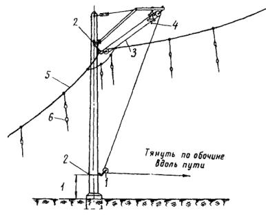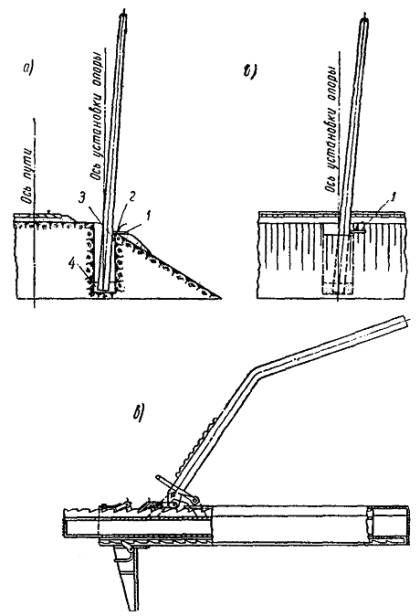 1.4. При производстве работ по сооружению контактной сети и тяговых подстанций надлежит выполнять действующие правила технической эксплуатации железных дорог, техники безопасности для строительных и монтажных работ, «Правила техники безопасности на строительно-монтажных работах при электрификации железных дорог», «Правила техники безопасности при работах по монтажу контактной сети и ЛЭП 6 - 10 кв, расположенных на ее опорах вновь электрифицируемых участков железных дорог», а также ведомственные инструкции по технике безопасности, относящиеся к данному виду работ. Раздел 2ТЕХНОЛОГИЯ СООРУЖЕНИЯ ОПОР КОНТАКТНОЙ СЕТИ2.1. ОБЩИЕ УКАЗАНИЯ2.1.1. Работы по сооружению контактной сети могут быть начаты только при наличии утвержденной проектной и технической документации, включая проект производства работ. 2.1.2. Основанием для составления проекта производства работ по сооружению контактной сети служат утвержденные технический проект (или проектное задание при двухстадийном проектировании) и проект организации строительства, а также рабочие чертежи-планы контактной сети по перегонам и станциям и типовые чертежи применяемых конструктивных элементов узлов и деталей. 2.1.3. Проекты производства работ должны устанавливать: а) методы и продолжительность сооружения контактной сети; б) последовательность производства работ; в) календарную потребность в кадрах и материально-технических ресурсах, а также способы ее удовлетворения. Кроме того, в проекте производства работ должны быть: а) ведомость фундаментов опор, анкеров и других конструкций (лежней, опорных плит, жестких поперечин и др.) с выделением участков установки опор «с пути» и «с поля» (по номерам опор); б) график поступления фундаментов и опор с производственных предприятий строительства и заводов-поставщиков; в) график работы комплектов механизмов; г) размещение и планы линейных (комплектовочных) баз. Проекты производства работ должны соответствовать действующим нормативным документам, определяющим порядок составления и утверждения проектов организации строительства и проектов производства работ: «Строительным нормам и правилам. Организационно-техническая подготовка к строительству. Основные положения» (СНиП III-A.6-62) и специальным инструкциям по железнодорожному строительству. 2.1.4. Для обоснования решений, принимаемых в проекте производства работ по сооружению контактной сети, необходимо: а) обследовать электрифицируемый участок, включая предусмотренные проектным заданием места установки опор «с пути» и «с поля», с целью уточнения времени выполнения работ по графику (с учетом весенней и осенней распутиц) и условий подъезда; б) согласовать с дорогой составленные на основании анализа расчетной (проектной) и фактической интенсивности движения поездов на электрифицируемом участке продолжительность и график предоставления «окон» для движения машин, перемещающихся по рельсовому пути, и возврата их на комплектовочные базы; в) установить и согласовать с дорогой места расположения линейных комплектовочных баз. 2.1.5. Опоры контактной сети «с поля» рекомендуется сооружать: а) при возможности беспрепятственно обеспечить подвоз опор и подъезд механизмов к пути или после выполнения небольших объемов земляных работ с помощью бульдозера, а также при отсутствии линий связи, 