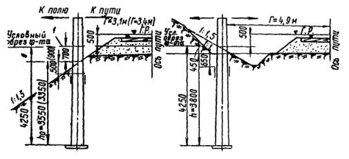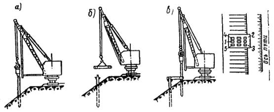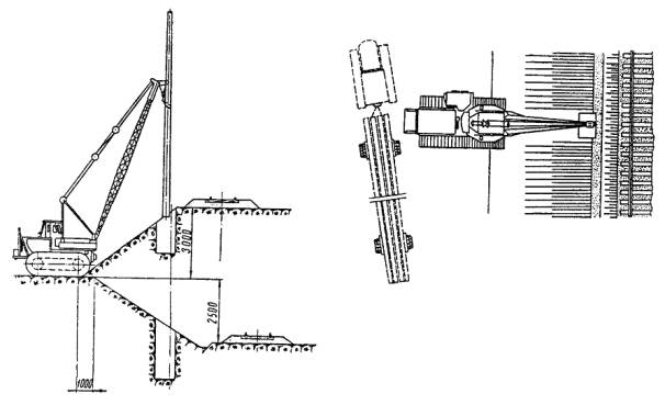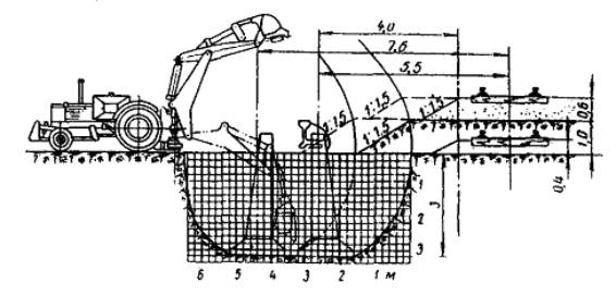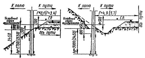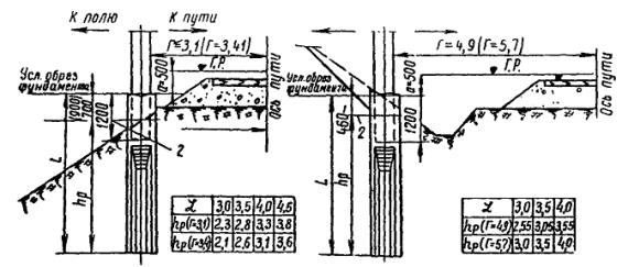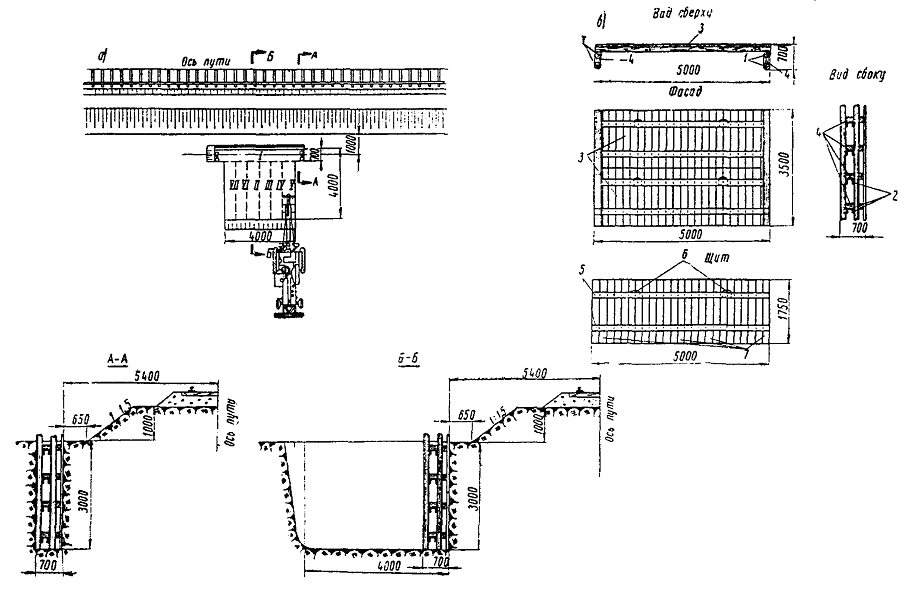 Первый способ. Экскаватор разрабатывает вдоль подошвы насыпи, параллельно оси пути, первую продольную траншею. Ее длина должна быть больше соответствующего размера котлована на 0,5 - 0,7 м с каждой стороны (рис. 22). При необходимости, для обеспечения стоянки экскаватора, нижняя часть откоса насыпи может быть временно удалена и не позднее чем через сутки должна быть вновь засыпана и уплотнена. Затем стенку траншеи со стороны пути закрепляют при помощи щитов. При этом распорки устанавливают по концам траншеи так, чтобы они не мешали экскаватору разрабатывать котлован последующими проходками перпендикулярно оси пути. Затем экскаватор разрабатывает котлован при закрепленной стенке со стороны пути таким образом, чтобы проходки по границам котлована были выполнены последними. Рис. 22. Схема разработки экскаватором котлована для фундаментов опор гибких поперечин: а - последовательность разработки котлована; б - конструкция деревянного щита; 1 - стойка; 2 - бобышка; 3 - щит; 4 - распорки; 5 - бруски 160´160´5000 мм; 6 - монтажные петли; 7 - доски 50´200´1750 мм Грунт, полученный от первой проходки экскаватора, укладывают в отвал со стороны поля и в дальнейшем перемещают бульдозером за пределы границы котлована. Второй способ. Экскаватор разрабатывает котлован несколькими проходками, перпендикулярными оси крайнего пути, с отвалом грунта за пределы котлована (рис. 23). Рис. 23. Разработка котлована экскаватором без крепления стенок Ширина траншей соответствует ширине ковша. Число проходок определяется размерами котлованов в плане и наибольшим радиусом выгрузки. Разработку котлованов по второму способу можно производить только при расстояниях от оси пути до ближайшей грани опоры, равных 5,5 м на нулевых местах и 7,6 м на насыпи высотой до 1 м (см. рис. 23), позволяющих отрывать котлован механизированным способом без ручной доработки. В остальных случаях рытье котлованов целесообразно вести по первому способу. 2.8.8. В междупутье разработка котлованов ведется траншеями, параллельными осям путей, с погрузкой грунта на платформы. Часть грунта, необходимая для засыпки пазух котлованов, оставляется в междупутье. Доработка котлованов до проектных отметок и последующая засыпка пазух котлованов осуществляется автокранами с грейферными ковшами. Котлован в междупутье закрепляется со стороны обоих путей согласно указаниям п. 2.8.7 (см. рис. 22). 2.8.9. Подачу локомотива с платформами под погрузку грунта следует производить поочередно, по одному из двух соседних с котлованом станционных путей. По мере разработки котлована и удаления экскаватора от оси пути, на котором стоит локомотив с платформами и когда расстояние между экскаватором и платформой становится равным радиусу погрузки, локомотив с платформами необходимо переставить на станционный путь с другой стороны котлована. 2.8.10. В случае, если разработка котлованов при помощи экскаватора невозможна, рекомендуется применять многоковшовые котлованокопатели в комплексе с кранами, оборудованными грейферными ковшами или транспортерами. В этом случае грунт разрабатывают котлованокопателем с перекидкой грейфером или транспортером. Котлован окончательно дорабатывают по глубине (при необходимости) краном МК-15 с грейферным ковшом емкостью 0,75 м3. 2.8.11. Предоставление «окон» для работы многоковшовых котлованокопателей, кр