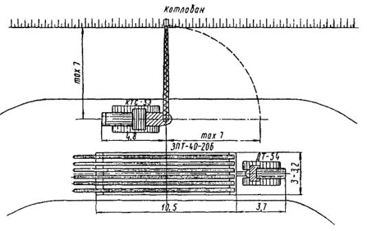 Рис. 19. Экскаватор Э-302 16. Тепловоз ТГМ1 Техническая характеристика маневровый и Род службы..................................................................................... промышленный односекционный с Тип............................................................................................... гидромеханической передачей Двигатель................................................................................................. 1Д12 Мощность силовой установки.............................................................. 400 л.с. Сила тяги длительная: маневровый режим........................................................................ 12200 кГс поездной режим................................................................................ 6100 » Конструкционная скорость.................................................................. 50 км/ч Осевая формула....................................................................................... 0-3-0 Ширина колеи....................................................................................... 1524 мм Служебный вес......................................................................................... 48 т Давление от колесной пары на рельсы................................................. 16 т Диаметр колес по кругу катания........................................................ 1050 мм Минимальный радиус проходимых кривых.......................................... 60 м Полная длина тепловоза (по осям автосцепок)................................. 9750 мм Ширина кузова....................................................................................... 3150 » Высота тепловоза (от головки рельсов)............................................... 3940 » Запасы: топлива.............................................................................................. 1350 кг масла.................................................................................................... 135 » воды..................................................................................................... 200 » песка.................................................................................................... 200 » 17. Тепловоз ТГМ3 Техническая характеристика маневровый Род службы.................................................................................... и промышленный односекционный с Тип............................................................................................... гидромеханической передачей Двигатель................................................................................................ М-751 Мощность силовой установки.............................................................. 750 л.с. Сила тяги длительная: маневровый режим (при скорости 3 км/ч).................................. 20400 кГс поездной режим (при скорости 16 км/ч)........................................ 8900 » Конструкционная скорость.................................................................. 90 км/ч Осевая формула..................................................................................... 0-2-2-0 Ширина колеи....................................................................................... 1524 мм Служебный вес......................................................................................... 68 т Давление от колесной пары на рельсы.................................................. 17 » Диаметр колес по кругу катания........................................................ 1050 мм Минимальный радиус проходимых кривых.......................................... 40 м Полная длина тепловоза (по осям автосцепок)................................ 12600 мм Ширина кузова....................................................................................... 3000 » Высота тепловоза (от головок рельсов)............................................... 4310 » Длина базы тележки.............................................................................. 6000 » Запасы: топлива.............................................................................................. 2800 кг воды..................................................................................................... 430 » песка.................................................................................................... 400 » масла.................................................................................................... 300 » Приложение 3СХЕМА КОМПЛЕКТОВОЧНОЙ БАЗЫ
