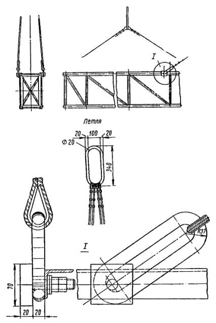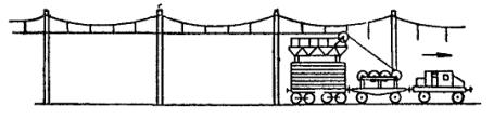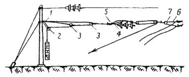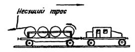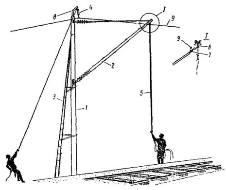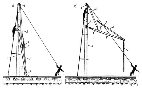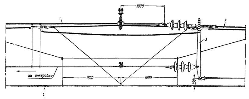 Примечание. При расстояниях между опорами, отличающихся от приведенных в таблице, длину поперечного несущего троса определяют путем интерполяции. Длина фиксирующих тросов определяется непосредственным промером расстояния между опорами. 4.4.4. Монтаж и армирование гибких поперечин производят в следующем порядке: подвешивают верхний фиксирующий трос; подвешивают поперечно-несущие тросы; армируют тросы деталями (завеска точек); подвешивают нижний фиксирующий трос (после раскатки продольных несущих тросов, а для гибких поперечин, перекрывающих более десяти путей, - после раскатки несущих тросов и контактных проводов); регулируют гибкую поперечину (после подвески контактного провода). 4.4.5. Верхний фиксирующий трос подвешивают в следующем порядке: армируют анкеровочные штанги изоляторами; на одном конце верхнего фиксирующего троса заделывают клиновой зажим и крепят к тросу анкеровочную штангу с изоляторами; подвешивают один конец троса на опору через анкеровочную штангу; с помощью крюкового зажима поднимают второй конец троса на опору и уточняют необходимую длину троса; после этого конец троса опускают вниз, обрезают и заделывают в клиновой зажим; с помощью полиспаста конец троса поднимают на опору, вытягивают и крепят с изоляторами к опоре через предварительно подвешенную анкеровочную штангу. 4.4.6. Порядок подвески поперечно-несущих тросов рекомендуется следующий: производят армировку опор анкеровочными штангами с изоляторами; на конце поперечно-несущего троса заделывают клиновой зажим или коуш; подвешивают один конец всех поперечно-несущих тросов на опору через анкеровочную штангу с помощью полиспаста; трос перетаскивают через пути, к его концу прикрепляют крюковой зажим, с помощью полиспаста конец троса поднимают на опору и задают стрелу провеса необходимой величины. Наибольшая стрела провеса поперечно-несущего троса должна быть не менее 1/10 длины поперечного пролета. На поднятом тросе меткой отмечают необходимую длину и опускают его вниз; рубят трос по метке, заделывают его конец на клиновой зажим и соединяют с изоляторами заранее армированной анкеровочной штанги; с помощью полиспаста производят подъем и подвеску на опору второго конца поперечно-несущего троса. В том же порядке производится подвеска остальных поперечно-несущих тросов гибкой поперечины. При интенсивном движении поездов и занятости путей переброска поперечно-несущих тросов производится по верхнему фиксирующему тросу с применением люльки и поддерживающих крючьев. Примечания. 1. Концы троса, выступающие из клиновых зажимов, должны быть прикреплены к тросу проволочными бандажами. 2. Нижние точки всех поперечно-несущих тросов одной гибкой поперечины должны находиться на одном уровне. 3. Тросы гибкой поперечины не должны иметь выкрутов и изломов. 4.4.7. Армирование гибких поперечин производится в следующем порядке: на земле собирают гирлянды изоляторов и к ним крепят седла; при этом плашечные зажимы вывертывают и крепят проволокой к седлу; на поперечных несущих тросах для каждого электрифицируемого пути устанавливают зажим. При четырех несущих тросах два зажима, находящиеся в створе, следует соединять планкой; одновременно на верхнем фиксирующем тросе устанавливают хомутовые зажимы для крепления изоляторов. Бригадир или старший звена, нах