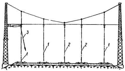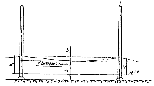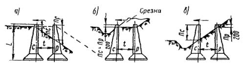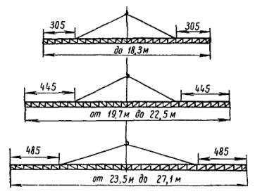 где l - расстояние между передними гранями опор на уровне крепления поперечно-несущих тросов, м (при определении l учитывается сбег опор и отклонение их от вертикали в полевую сторону); f - стрела провеса ненагруженного несущего троса, м. При расчете по этой формуле приближенно принимают: для опор высотой 15 м стрелу провеса, равную 5 м, а для опор высотой 20 м - 10 м. Таблица 9 Длины поперечных несущих тросов