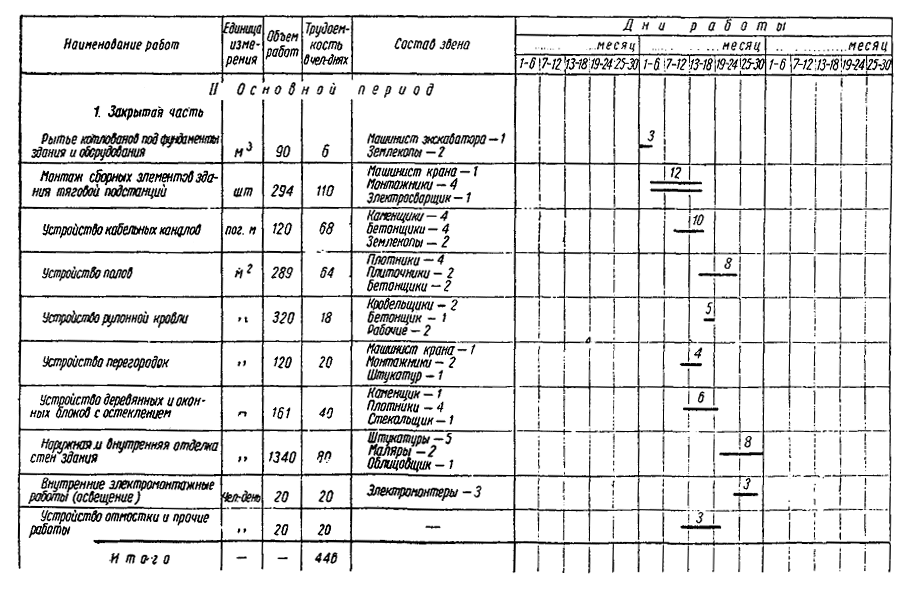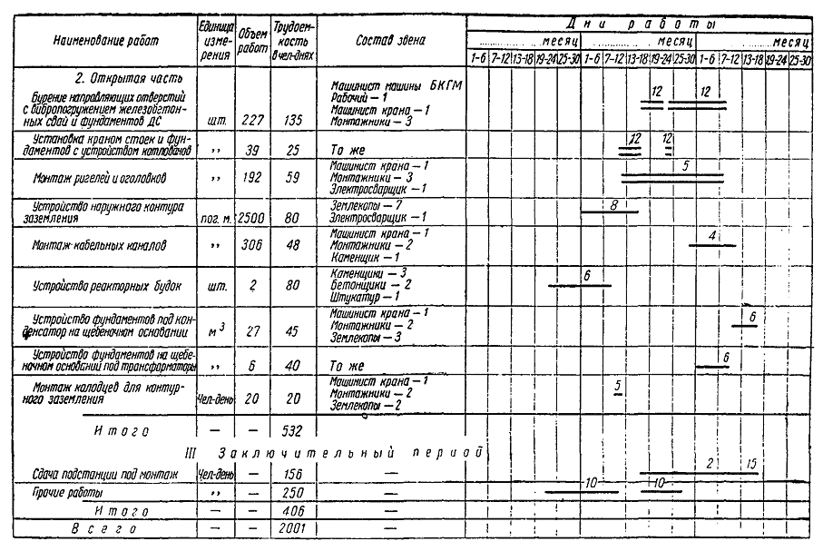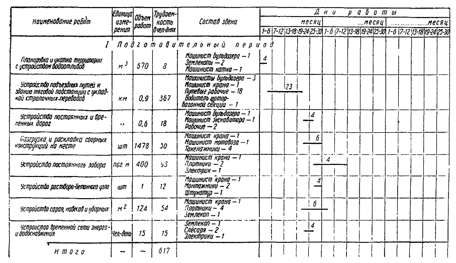 Рис. 30. Календарный график производства работ по строительству тяговой подстанции 3.2.3. В основной период выполняются следующие работы (рис. 30). I. Нулевой цикл: сооружение (свай-стоек) под оборудование открытой части тяговой подстанции; разработка котлованов под фундаменты здания и оборудования подстанции; установка фундаментов и колонн; засыпка котлованов, чистая планировка и укатка площади внутри здания, устройство бетонных полов; устройство наружного контура заземления. II. Надземный цикл: установка опор, ригелей, металлоконструкций и других конструкций открытой части; монтаж здания подстанции; монтаж кабельных каналов; устройство кровли; санитарно-технические и электротехнические работы; отделочные работы. 3.2.4. В заключительный период устраняются мелкие недоделки, а также производятся местная затирка и окраска поверхностей после производства электромонтажных работ. 3.2.5. Строительные работы основного периода и электромонтажные работы для сокращения сроков сооружения тяговых подстанций рекомендуется производить параллельными потоками. При этом сначала заканчиваются строительные работы на стороне высокого напряжения открытой части, после чего начинают монтаж электрооборудования. Затем по мере окончания сборки здания тяговой подстанции и строительных работ на стороне низкого напряжения бригада электромонтажников переходит на эти объекты. 3.3. ПРОИЗВОДСТВО РАБОТ ПОДГОТОВИТЕЛЬНОГО ПЕРИОДА3.3.1. Земляные работы при сооружении подъездного пути, устройстве водоснабжения, канализации, водоотводных сооружений и общей планировке площади застройки должны выполняться механизированным способом. Для выполнения земляных работ (копки котлованов, траншей, планировки территории, отсыпки насыпи и т.д.) рекомендуется следующий комплект машин: Бульдозер Д-259А...................................................................................................... 1 Экскаватор Э-221 или Э-302.................................................................................... 1 Автосамосвалы........................................................................................................ 3 - 4 Скрепер с ковшом емкостью 6 м3............................................................................ 1 Бригада для выполнения земляных работ состоит из 14 чел.: Бригадир..................................................................................................................... 1 Машинист бульдозера............................................................................................... 1 » экскаватора............................................................................................ 1 » скрепера.................................................................................................. 1 Шоферы...................................................................................................................... 4 Землекопы.................................................................................................................. 4 Плотники.................................................................................................................... 2 3.3.2. Укладку и балластировку пути рекомендуется производить с применением следующих машин и механизмов: крана МК-15 или КТС-5Э, электрифицированного инструмента, электростанции ЖЭС-9 и автомашины. Строительство подъездного пути протяжением 0,7 км может быть выполнено бригадой из 18 чел. за 22 смены. 3.3.3. Разгрузка и развозка конструкций по местам складирования, а также подача конструкций и материалов для строительной части подстанции должны осуществляться, как правило, по своевременно законченному строительством железнодорожному подъездному пути. 3.3.4. Все детали конструкций открытой части, заборы, колонны с башмаками, панели стен здания тяговой подстанции