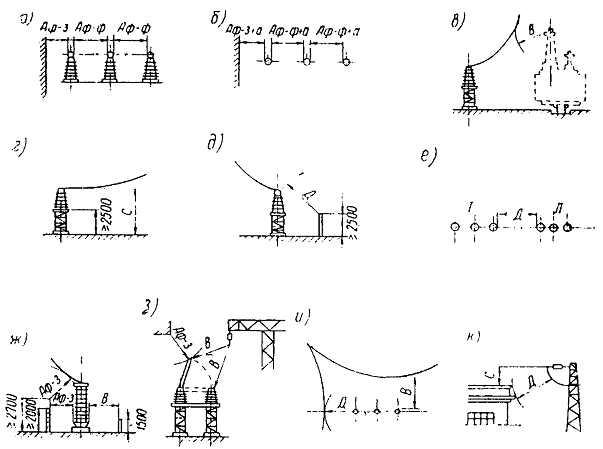 Примечания. 1. Приняты следующие обозначения: Н - трансформатор напряжения; О - однофазный; С - сухой (без масла); Т - трехфазный; М - масляный; К - с компенсационной обмоткой; И - пятистержневой в фарфоровой рубашке; числа - номинальное напряжение; З - для сетей с изолированной нейтралью; знак Æ - диаметр бака. 2. Все трехфазные трансформаторы соединены в звезду по схеме Y0/Y = 12. Приложение 15НАИМЕНЬШИЕ ДОПУСТИМЫЕ ИЗОЛЯЦИОННЫЕ РАССТОЯНИЯ В СВЕТУ ДЛЯ ЗАКРЫТЫХ РУ (мм)(см. рисунок)
