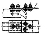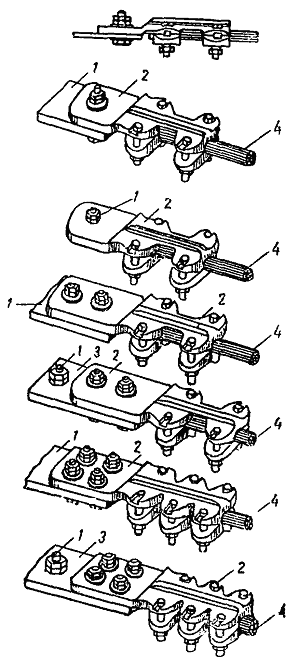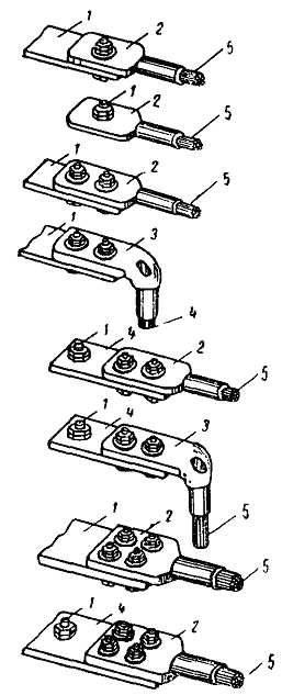 5.2.13. Присоединение гибких проводов к плоским контактным выводам аппаратов на тяговых подстанциях должна выполняться с помощью аппаратных и ответвительных прессуемых зажимов (рис. 51) и, как исключение, - с помощью аппаратных болтовых зажимов (рис. 52). Рис. 51. Соединение голых проводов, оконцованных аппаратным и ответвительным прессуемыми зажимами, с контактным выводом аппарата: 1 - контактный вывод аппарата; 2 - зажим аппаратный прессуемый; 3 - зажим ответвительный прессуемый; 4 - медная пластина; 5 - голый провод Рис. 52. Соединение голых проводов, оконцованных аппаратным болтовым зажимом, с контактным выводом аппарата: 1 - контактный вывод аппарата; 2 - зажим аппаратный болтовой; 3 - медная пластина; 4 - голый провод Прессуемые зажимы треста «Армсеть» изготовляются: для медных проводов - из сплава меди, а для алюминиевых проводов - из сплава алюминия. Они имеют одно, два и четыре отверстия для присоединения к контактным выводам аппаратов или шинам. В конструкции зажимов, предназначенных для алюминиевых проводов, предусмотрены переходные медные планки, скрепленные с телом зажимов пайкой или сваркой (на рис. 51 не показаны). Присоединение гибких проводов к стержневым нарезным контактным выводам можно выполнить одним из следующих способов: медные провода присоединяют непосредственно с помощью болтовых или прессуемых аппаратных зажимов, имеющих в лапке зажима одно отверстие, если диаметр стержневого вывода равен 12 мм; медные провода (если диаметр стержневого вывода больше 12 мм) или алюминиевые провода присоединяют через промежуточные медные пластины с помощью болтовых или прессуемых аппаратных зажимов. В этом случае применяются аппаратные зажимы, имеющие в лапке зажима 2 или 4 отверстия. Способ оконцевания голых проводов, присоединяемых к аппаратам, определяется проектом. 5.2.14. Провода в местах установки аппаратных болтовых зажимов должны быть промыты бензином и тщательно очищены стальной щеткой; перед чисткой щеткой алюминиевые провода закрывают вазелином. После очистки вазелин удаляют с проводов тряпкой, смоченной бензином, и заменяют слоем чистого вазелина. Перед закреплением алюминиевых проводов контактные поверхности алюминиевых аппаратных зажимов покрывают слоем вазелина. Затем контактные поверхности слегка обрабатывают напильником для удаления с поверхности пленки окиси. После обработки загрязненный вазелин удаляется с помощью тряпки, смоченной бензином, и заменяется тонким слоем чистого вазелина. Луженые медные желобки, предназначенные для закрепления медных проводов в зажимах, следует промыть бензином и покрыть слоем вазелина. Зачищать шкуркой такие желобки не следует. Провода в зажиме необходимо закреплять следующим образом: заложить провода в соответствующие желобки зажима (при монтаже переходных зажимов с меди на алюминий медный провод должен соприкасаться с луженым медным желобком, а алюминиевый провод - с алюминием), установить плашки, покрыть нарезанную часть болтов морской смазкой марки АМС-1, не допуская попадания ее на контактную поверхность, и затянуть болты. Затяжку болтов гайками следует производить равномерно с тем, чтобы все части зажима испытывали одинаковое давление по длине контакта. После полной затяжки болтов между плашками должен оставаться зазор 3 - 4 мм. Сближение плашек вплотную указыва