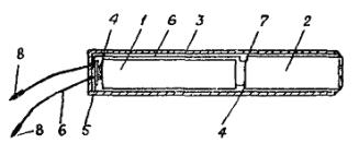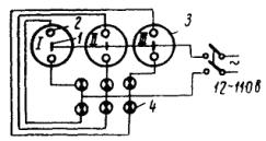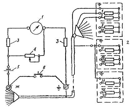 3. Жилоискатель типа ЖИ-30. Карманный искатель жил У жилоискателя типа ЖИ-30 в качестве индикатора (указателя номера жилы) служит омметр (рис. 4), изготовленный из микроамперметра на 300 мка типа М-24. Его деления обозначены порядковыми номерами от 1 до 30. Второй частью прибора является магазин сопротивлений, состоящий из 30 сопротивлений различной величины, от каждого из которых сделан вывод к соответствующему зажиму. Зажимы обозначены порядковыми номерами. Жилы кабеля находятся следующим образом: после разделки кабеля с обеих сторон концы всех жил зачищают до металлического блеска. На одном конце кабеля жилы его присоединяют к магазину сопротивлений в произвольном порядке. Этим самым каждой жиле присваивается номер и соответствующее сопротивление относительно земли или свинцовой оболочки кабеля. Перед началом операции прозвонки проверяют нулевое положение стрелки омметра, соответствующее контрольной точке 30. Последовательно с микроамперметром включено углеродистое сопротивление типа ВС-05 на 1000 ом, которое вместе с микроамперметром шунтировано переменным сопротивлением типа СП-II на 15000 ом, служащим для компенсации падения напряжения в батарейке карманного фонаря типа КВС-0,5, питающей прибор. Этим переменным сопротивлением устанавливают стрелки микроамперметра на контрольную точку 30. Для замыкания зажимов прибора при контроле служит кнопка. Соединив с другого конца кабеля зажим омметра, обозначенный знаком заземления (равно, как соответственно обозначенные зажимы магазина сопротивлений), с землей или металлической оболочкой кабеля, касаются поочередно каждой жилой кабеля к зажиму Ж прибора. При этом через прибор каждый раз будет протекать ток, величина которого будет зависеть от величины подключенного сопротивления, соответствующего определенной жиле, и стрелка прибора будет показывать номер жилы, которой прикоснулись к зажиму Ж. При помощи описанного прибора можно прозванивать одновременно до 30 жил при длине их до 3 км (см. рис. 4). Для проверки правильности монтажа проводок в пределах панелей щитов, если эта проводка выполнена в два или более слоев, в коробах, жгутами и т.п., когда за направлением проводов непосредственно проследить невозможно, применяется карманный искатель, состоящий из сухого элемента от батарейки карманного фонаря и указательного блинкера (рис. 5). Рис. 4. Жилоискатель: 1 - омметр (микроамперметр); 2 - магазин сопротивлений; 3 - сопротивления; 4 - сопротивление переменное; 5 - батарея от карманного фонаря; 6 - кнопка Рис. 5. Карманный жилоискатель: 1 - элемент; 2 - блинкер; 3 - корпус; 4 - контакт; 5 - пластина; 6 - провод; 7 - зажим; 8 - выводы вилки для проверки цепи Элемент и блинкер заключены в цилиндрический пластмассовый корпус. Один контакт элемента присоединен к зажиму блинкера, второй контакт замыкается свинцовой пластиной, к которой подсоединен провод. От второго зажима блинкера отходит провод. Провода оконцованы однополюсными вилками. Касаясь вилкой (см. рис. 5) концов проверяемой цепи, можно судить о правильности подсоединения. Приложение 12ХАРАКТЕРИСТИКА СТАЛЕАЛЮМИНИЕВЫХ ПРОВОДОВ НОРМАЛЬНОЙ ПРОЧНОСТИ