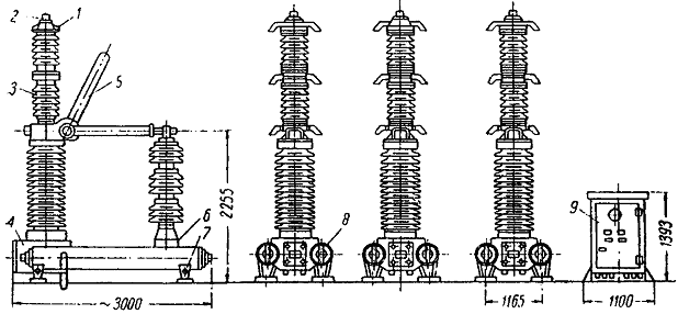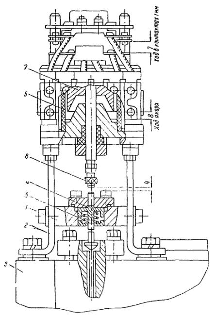 Кроме того, у бригады должны быть клещи типа ПК-1, с помощью которых можно оконцовывать и соединять опрессованием медные и алюминиевые жилы проводов сечением 16 ¸ 50 мм2 и перекусывать шины сечением до 70 мм2. Вес пресса РГП-7М в рабочем состоянии - 6,5 кг; вес клещей типа ПК-1 - 2,5 кг. Ошиновку с помощью машины МШТС-2 выполняют 3 чел. г) Открытые распределительные устройства5.2.17. При монтаже открытых распределительных устройств производится ревизия, сборка, установка и регулировка разъединителей, отделителей и короткозамыкателей. Работы выполняются следующим образом: устанавливают с помощью автокрана оборудование на строительные конструкции; выверяют правильность установки оборудования, проверяя положение осей симметрии и по уровню; закрепляют опорную раму; устанавливают приводы и промежуточные подшипники; производят предварительное сочленение разъединителя с приводом и блок-контактами; регулируют контакты и проверяют их нажатие; проверяют одновременность включения контактов; производят общую регулировку разъединителя, привода и блок-контактов; окончательно соединяют разъединитель с приводом. 5.2.18. При ревизии разъединителей, отделителей и короткозамыкателей выполняются: наружный осмотр, очищается пыль и грязь; проверка состояния поверхности фарфоровых деталей, на которых не должно быть трещин и сколов; проверка состояния контактных поверхностей (отсутствие раковин и пленки окиси); проверка отсутствия боковых ударов ножа о губки и ударов ножа о головку изолятора; проверка исправности пружин и ножей и наличие требуемого нажатия контакта; проверка состояния гибких связей и всех креплений. Ножи должны входить в губки плавно, без ударов; зазор при полностью включенном ноже между его нижней гранью и головкой изолятора должен быть 3 - 5 мм. При полном отключении ножа угол его поворота должен соответствовать паспортным данным этого изделия. Плотность прилегания контактов определяется щупом толщиной 0,05 мм и шириной 10 мм. Щуп не должен входить между неподвижным контактом и ножом на глубину более 4 - 5 мм. Контактное давление проверяют путем замера динамометром усилия при вытягивании ножа из губок. Величина усилия должна соответствовать следующим данным: Усилие Номинальный ток разъединителя, а вытягивания, кг 400.......................................................................................................... 10 - 12 600.......................................................................................................... 16 - 18 1000........................................................................................................ 18 - 20 2000 - 3000............................................................................................ 50 - 60 4000........................................................................................................ 70 - 80 Силу нажатия регулируют нажимными винтами или пружинами, предусмотренными для этой цели в данной конструкции. 5.2.19. Одновременность включения ножей регулируют изменением длин междуполюсных тяг. Величина зазора между запаздывающим ножом и губкой в момент касания губок опережающим ножом не должна превышать 3 мм для разъединителей напряжением до 35 кв и 5 - 7 мм - до 220 кв. Величина холостого хода (люфта) рукоятки привода при оперативных переключениях для всей передачи не должна быть более 5° (см. ВСН 12-59, п. 391). При необходимости производится регулировка путем изменения длины тяг. 5.2.20. По окончании монтажа все трущиеся части контактной системы и привода должны быть промыты бензином и смазаны соответствующей смазкой: 