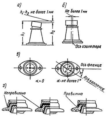 где cosj - коэффициент мощности, берется в пределах 0,5 ¸ 0,7. Для уменьшения числа витков намагничивающей обмотки при сушке трансформаторов необходимо уменьшить напряжение питания этой намагничивающей обмотки. Для этой цели могут быть использованы сварочные или печные трансформаторы. 5.2.101. В процессе сушки при ограниченном вакууме непрерывный отсос увлажненного воздуха из бака трансформатора должен производиться (пока выделяется влага) заменой (вытеснением) его подогретым до 100 - 110° более сухим воздухом или азотом через нижний кран бака без снижения при этом температуры сушки и наибольшей допустимой степени разряжения. о) Отбраковка и монтаж фарфоровых изоляторов5.2.102. У опорных изоляторов при отбраковке (ревизии и подборе) проверяют: 1) отсутствие на поверхности глазури трещин (осмотр производится при помощи увеличительного стекла); 2) отсутствие отбитых краев и сколов у изоляторов внутренней установки площадью более 1 см2 и глубиной 1 мм, а у изоляторов наружной установки - длиной более 60 мм и глубиной более 10 мм (только на одной юбке); дефектное место, если оно не превышает нормы, должно быть покрыто двумя слоями бакелитового или глифталевого лака с просушкой каждого слоя; 3) отсутствие на поверхности глазури вкраплений песка и металла (от электросварки), лысин площадью более 3 см2 и т.п.; 4) прочность армировки колпачка и фланца; отсутствие выкрашивания из швов цементирующей замазки; шов должен быть покрыт влагостойким лаком (в ЗРУ - лаком № 351, в ОРУ - глифталевым лаком); 5) диаметр отверстий в головке и фланце; расстояние между отверстиями (эти размеры должны соответствовать ГОСТу); 6) внешние размеры изоляторов (рис. 62); высота изолятора не должна отличаться от стандартной более чем на ± 3 мм (изоляторы с одинаковым отклонением по высоте группируются); смещение оси колпачка относительно оси фланца не должно быть более ± 3 мм. 5.2.103. У проходных изоляторов дополнительно проверяют: 1) резьбу и диаметр токоведущего стержня; 2) соответствие размеров токоведущего стержня номинальному току изолятора; 3) отсутствие конусности у токоведущих стержней круглого сечения; 4) отсутствие коррозии контактных поверхностей (поверхности зачищаются стальной щеткой и смазываются нейтральным вазелином); 5) наличие антикоррозийного покрытия на болтах, гайках и шайбах (применяются чистые); 6) наличие медных или латунных контргаек у гаечных контактов (при круглых стержнях) и пружинящих шайб у болтовых контактов (при плоских стержнях). 5.2.104. При отбраковке проходные изоляторы подбираются в соответствии со схемой заполнения по их номинальным токам. Рис. 62. Дефекты в армировке изоляторов: а - непараллельность колпачка и фланца; б - несовпадение центра колпачка с осью изолятора; в - несовпадение осей отверстий колпачка и фланца; г - отсутствие зазора в шве армировки 5.2.105. У подвесных изоляторов дополнительно проверяют: 1) наличие замков (шплинтов) фирменного изготовления; 2) отсутствие трещин, коррозии и целость антикоррозийного покрытия на деталях сцепной арматуры; 3) прочность посадки пестика и шапки, отсутствие выкрашивания замазки. 5.2.106. В процессе отбраковки подвесные изоляторы сортируют по цветам и оттенкам глазури, после чего собирают в гирлянды. 5.2.107. При монтаже опорные изоляторы крепят: 1) на стенах толщиной до 100 мм - сквозными болтами или шпильками; при этом д