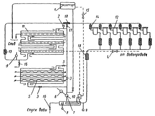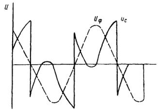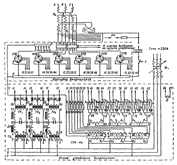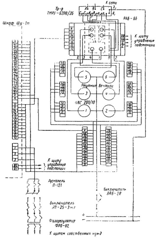 Значения U1 и Р1 указаны на заводском щитке трансформатора. Величины анодных токов и фазных напряжений вторичной обмотки (необходимые для выбора сечения проводов) для выпрямителя ИВС-200/10´6: Ud Id I2 U2 3300 в 1200 а 372 а 3020 в. Ток в каждой ветви уравнительного реактора равен половине выпрямленного. 5.3.51. Шкаф управления присоединяют к ртутным вентилям и панелям управления РВ по схемам, приведенным на рис. 70 и 71, а присоединение системы охлаждения ртутного выпрямителя к теплообменнику - на рис. 72. Рис. 70. Монтажная схема выпрямителя ИВС-200/10´6 со шкафом ШУ-1М Все контакты, а особенно контакты цепей зажигания должны быть проверены и подтянуты. Органы управления (ключи, рубильники, кнопки и т.д.) монтируют на щите управления подстанции. Однако на установках, где панель управления агрегатом очень загружена аппаратурой и приборами, а также для уменьшения длины проводов рекомендуется вблизи теплообменника устанавливать отдельный щиток, от которого можно питать электродвигатель насоса, подогреватель теплообменника, электродвигатель насоса первичного цикла и другие потребители электрической энергии. 5.3.52. Установка теплообменника производится согласно установочным чертежам системы охлаждения. Выпрямитель присоединяют к магистрали, идущей от теплообменника, при помощи резинового шланга диаметром 65 мм. Шланги длиной 14 м поставляются вместе с преобразователем. Укорачивание шлангов (длина одного шланга диаметром 65 мм равна 7 м) не рекомендуется. Если теплообменник устанавливают на расстоянии более 7 м от выпрямителя, то от теплообменника прокладывают водопроводные трубы необходимой длины и диаметра. Рис. 71. Схема шкафа управления выпрямителя Рис. 72. Схема охлаждения выпрямителя ИВС-200/10´6 от теплообменника АТВ-3000-П: 1 - бачок расширительный; 2 - термометр ртутный в оправе 0 ¸ 100 °С; 3 - вентиль запорный Д-40; 4 - вентиль запорный, муфта диаметром 1½"; 5 - электронагреватель (U = 220/380 в, Р = 2 квт); 6 - электродвигатель; 7 - насос водяной; 8 - манометр пружинный; 9 - термосигнализатор; 10 - терморегулятор; 11 - теплообменник; 12 - вентили выпрямителей; 13 - струйное реле диаметром 1½"; 14 - шланг дюритовый диаметром 27/31 мм; 15 - вентиль запорный диаметром ½"; 16 - вентиль для спуска воды диаметром ½"; 17 - вентиль для спуска воздуха; 18 - шланг резиновый тканевый, напорный диаметр 65 мм Необходимо обратить внимание на плотное и надежное соединение шлангов и труб при помощи стальных хомутов. 5.3.53. После подключения цепей зажигания, подхватывающих анодов и сеток к вентилям и питания к шкафу управления производят проверку настройки и фазировки напряжений на элементах аппаратуры собственных нужд. Методика проверки следующая: а) с помощью осциллографа ЭО-7 проверяется кривая напряжения заряда и разряда конденсатора (рис. 73) блоков зажигания (С1, С2, С3) (рис. 74). Напряжение на вход осциллографа следует подавать с высокоомного омического делителя напряжения, рассчитанного таким образом, чтобы подаваемое на входные клеммы осциллографа напряжение составляло примерно одну десятую часть от напряжения на конденсаторе, что предотвращает пробой на входе осциллографа. Напряжение на конденсаторе при резонансе должно иметь форму кривой (см. рис. 73). При этом величина амплитуды напряжения на конденсаторе должна составлять 1,2 - 1,3 U2 (U2 - амплитудное значение напряжения на вторичной обмотке зарядных трансформа