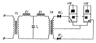 где Id - номинальный выпрямленный ток. Первичный линейный ток сети, питающий главный трансформатор, зависит от напряжения сети U1 и первичной номинальной мощности трансформатора Р1 и равен: