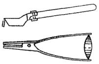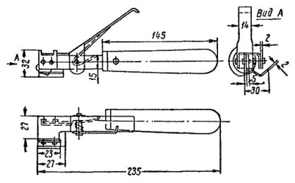 5.3.79. В закрытой части подстанции для кабелей напряжением до 10 кв с бумажной изоляцией применяют сухую разделку с применением полихлорвиниловой ленты и изоляционного лака или разделывают в воронках с заливкой их кабельной массой. Рис. 79. Сухая заделка контрольного кабеля с бумажной изоляцией с применением полихлорвиниловой ленты, полихлорвиниловых трубок и лаков: 1 - голая жила; 2 - лента полихлорвиниловая липкая; 3 - трубка полихлорвиниловая; 4 - жила в заводской изоляции; 5 - «замок» из липкой полихлорвиниловой ленты; 6 - оголенный участок жилы; 7 - лак № 2; 8 - свинцовая или алюминиевая оболочка кабеля; 9 - бандаж из мягкой оцинкованной проволоки; 10 - броня кабеля Концы низковольтных силовых и контрольных кабелей с бумажной изоляцией заводят на открытой части подстанции в клеммные ящики и разделывают в воронках. В закрытой части подстанции может применяться сухая разделка кабеля. Для силовых и контрольных кабелей с резиновой изоляцией применяется только сухая разделка с покрытием изоляционным лаком. 5.3.80. Во избежание последующих аварий необходимо обращать особое внимание на тщательность соединений и качество концевых заделок кабелей. 5.3.81. Выбор вида концевых заделок контрольных кабелей в зависимости от изоляции и разности уровней концов прокладываемых кабелей производится по табл. 15. 5.3.82. Сухая заделка кабелей с бумажной изоляцией с применением полихлорвиниловой ленты, полихлорвиниловых трубок и лаков (рис. 79) выполняется следующим образом: отмеряют необходимую длину разделки; с конца кабеля снимают оболочку брони и на расстоянии 30 мм от нее свинцовую (или алюминиевую) оболочку и общую изоляцию. Предварительно на броню накладывают бандаж из мягкой проволоки диаметром 1 мм или из кровельной стали и протирают поверхность свинцовой или алюминиевой оболочки кабеля тряпкой, смоченной в бензине или керосине до полной чистоты. Операции по надрезу свинцовой оболочки выполняют кабельным ножом типа ПК-1. На расстоянии 2 мм от места среза брони делают на оболочке один кольцевой надрез и, отступив от него на 10 мм, - второй. От второго кольцевого надреза и до конца кабеля делают продольный надрез оболочки. Сначала удаляют часть свинцовой оболочки, заключенной между продольными надрезами, а затем ее снимают полностью, начиная от конца кабеля, до второго кольцевого надреза. Снятие алюминиевой оболочки выполняется специальным ножом (рис. 80): вначале делают кольцевые надрезы, а затем от второго кольцевого надреза надрезают по винтовой линии и снимают оболочку до второго кольцевого надреза. При выполнении надрезов нужно следить за тем, чтобы не прорезать оболочку. Глубина надреза не должна превышать 2/3 толщины оболочки. Рис. 80. Нож для снятия с кабеля свинцовой оболочки В целях предохранения изоляции от возможных разрывов кольцевой пояс свинцовой или алюминиевой оболочки, заключенной между двумя кольцевыми надрезами, удаляют только после выполнения «замков» на жилах и надевания на них полихлорвиниловых трубок. Общую изоляцию от торца оболочки до конца кабеля удаляют путем размотки и обрыва отдельных ее лент. После разделки конца кабеля удаляют изоляцию каждой жилы на длине 10 - 15 мм, отступая 15 мм от второго кольцевого надреза. Оголенный участок жил и их изоляцию обезжиривают протиранием чистой тряпкой, смоченной в бензине. Затем нижний 