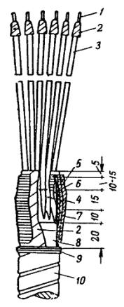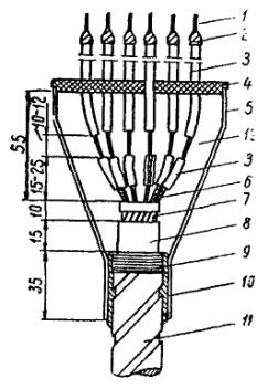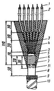 Примечание. Расход материалов подсчитан для заделки бронированного кабеля сечением 2,5 мм2 с бумажной изоляцией при длине разделки 1 м. 5.3.83. Заделка с применением эпоксидного компаунда (рис. 81) выполняется следующим образом. Снятие брони, свинцовой или алюминиевой оболочки производится как указано в п. 5.3.82. Первый концевой надрез на свинцовой или алюминиевой оболочке делают на расстоянии 50 мм от среза брони, а второй - на 10 мм отступя от первого. После удаления оболочки общей изоляции до второго кольцевого надреза снимают изоляцию жил. Для этого на расстоянии 30 мм от второго кольцевого надреза (что соответствует краю общей изоляции) предварительно накладывают на изоляцию каждой жилы бандаж из суровых ниток. Рис. 81. Заделка контрольного кабеля с бумажной изоляцией с применением эпоксидного компаунда: 1 - голая жила; 2 - труба полихлорвиниловая; 3 - бандаж из суровых ниток; 4 - жила в заводской изоляции; 5 - поясная изоляция; 6 - эпоксидный компаунд; 7 - оболочка из тафтяной ленты; 8 - оболочка кабеля; 9 - бандаж из мягкой оцинкованной проволоки; 10 - броня кабеля; 11 - насечка на оболочке Далее снимают кольцевой поясок оболочки и накладывают бандаж из суровых ниток на край изоляции. Ступени оболочки, изоляции, а также оголенные и изолированные участки жил тщательно обезжиривают с помощью тряпки, смоченной в отвердителе № 1. На длине 25 - 30 мм от первого кольцевого надреза на свинцовой или алюминиевой оболочке делают насечку ножом. Из эпоксидной шпаклевки Э-4021 и отвердителя № 1 приготавливают заливочный компаунд (на 100 весовых частей шпаклевки Э-4021 добавляют 12 весовых частей отвердителя № 1, смесь тщательно перемешивают). Голые участки жил на длине 20 мм, изолированные участки жил, общая изоляция и ступень оболочки покрывают тонким слоем эпоксидного компаунда. Покрытие затвердевает через 25 - 30 мин. После этого на жилы кабеля надевают обезжиренные отвердителем № 1 полихлорвиниловые трубки так, чтобы расстояние между изоляцией жилы и концом трубки по жиле было 20 мм. На оболочку с заходом на общую изоляцию наматывают тафтяную ленту в 3 слоя с промазкой каждого слоя эпоксидным компаундом. Съемную форму устанавливают так, чтобы она заходила на оболочку кабеля на 30 мм. Съемная конусная форма может быть изготовлена из жести толщиной 0,5 мм или из электрокартона. Установленную и уплотненную изоляционной лентой форму заливают эпоксидным компаундом. Перед заливкой необходимо развести жилы кабеля так, чтобы расстояние между оголенными участками было не менее 2 мм. Положение жил при заливке (в случае большого количества жил) фиксируют с помощью шаблона из электрокартона, устанавливаемого на шинах несколько выше съемной формы, чтобы не мешать заливке. Смешивание эпоксидной шпаклевки с отвердителем, наложение герметизирующей оболочки и заливку порошка следует производить в резиновых (анатомических) перчатках и защитных очках, следя за тем, чтобы указанные материалы не попадали на кожу. При попадании капель на кожу необходимо немедленно смыть их ацетоном, а затем промыть водой с мылом. При подключении разделанных концов жил к зажимам аппарата концы полихлорвиниловых трубок и выходящую из них голую жилу кабеля обматывают липкой полихлорвиниловой лентой с обмоткой жилы и трубки на 10 - 15 мм. Необходимые для выполнения заделок материалы приведены в табл. 18. Таб