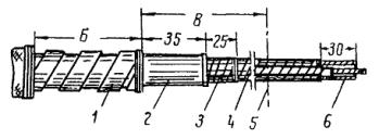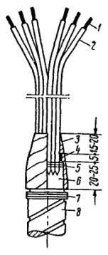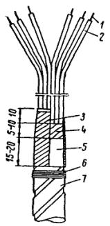 Примечания. 1. Расход материалов подсчитан для заделки бронированного кабеля сечением 2,5 мм2 при длине разделки 1 м. 2. Тип воронок указан по номенклатуре заводов Главэлектромонтажа. Рис. 83. Заделка контрольного кабеля с резиновой изоляцией с применением защитного найритового покрытия: 1 - голая жила; 2 - резиновая изоляция с нанесенным найритовым покрытием; 3 - лента полихлорвиниловая липкая; 4 - прорезиненная тканевая лента; 5 - оболочка; 6 - бандаж из мягкой оцинкованной проволоки; 7 - броня кабеля Кабельную массу разогревают в электрическом разогревателе, а при отсутствии его - на угольной жаровне в металлической кастрюле с крышкой и носиком до температуры 140 °С. Перед заливкой воронку подогревают паяльной лампой и затем заливают массой в два приема: вначале на 2/3 ее высоты, затем после некоторого остывания и усадки массы воронку доливают доверху и закрывают крышкой. Воронку и крепящую ее скобу (или хомут) окрашивают асфальтовым лаком. При заделке концов жил для подключения к зажимам аппаратуры концы полихлорвиниловых трубок и выходящую из них голую жилу кабеля обматывают полихлорвиниловой лентой с перекрытием жилы и трубки на 10 - 15 мм. Материалы, необходимые на одну заделку, приведены в табл. 20. 5.3.85. Заделку кабелей, имеющих резиновую изоляцию жил с применением защитного найритового покрытия (рис. 83), выполняют следующим образом: с конца кабеля ножом или с помощью паяльника снимают броню и свинцовую или полихлорвиниловую (винилитовую) оболочку. Предварительно на броню накладывают бандаж из мягкой проволоки диаметром 1 мм или из кровельной стали. Оболочку оставляют на разделанном конце на расстоянии 15 - 20 мм от брони кабеля. Заусенцы, оставшиеся на свинцовой оболочке, зачищают и оболочку слегка разбортовывают. На расстоянии 5 - 10 мм от оболочки оставляют подмотку из прорезиненной тканевой ленты. Жилы кабеля у корешка заделки разводят, а корешок заделки с выходящими из него жилами кистью тщательно покрывают защитным найритовым покрытием (марки МКФ). Жилы кабеля у корешка заделки на 15 - 20 мм от оболочки плотно обматывают несколькими слоями полихлорвиниловой ленты с заходом на такой же длине на свинцовую или полихлорвиниловую оболочку кабеля. На резиновую изоляцию жил кабеля после окончания заделки пульверизатором или кистью наносят покрытие (марки МКФ). Для понижения вязкости покрытия МКФ применяют разбавитель из равных по объему частей бензина и этилацетата. Найритовую смесь перед употреблением взбалтывают. После покрытия равномерным слоем жил кабеля и корешка заделки их необходимо выдержать не менее 20 - 30 мин для того, чтобы растворитель улетучился. Затем покрытие припудривают тальком (чтобы оно не прилипало к рукам). Время для стабилизации защитного слоя желательно увеличить, а припудривание тальком производится через 20 - 25 мин. 5.3.86. Заделку с применением полихлорвиниловых трубок (рис. 84) следует применять только при отсутствии защитного найритового покрытия. С конца кабеля снимают броню и свинцовую или полихлорвиниловую оболочку кабеля. Ступень оболочки оставляется на расстоянии 20 - 25 мм от брони кабеля. Заусенцы, оставшиеся на свинцовой оболочке, зачищают и оболочку слегка разбортовывают. На расстоянии 5 мм от оболочки оставляют заводскую обмотку из прорезиненной тканевой ленты. По окончании разделки кабеля на жилы надев