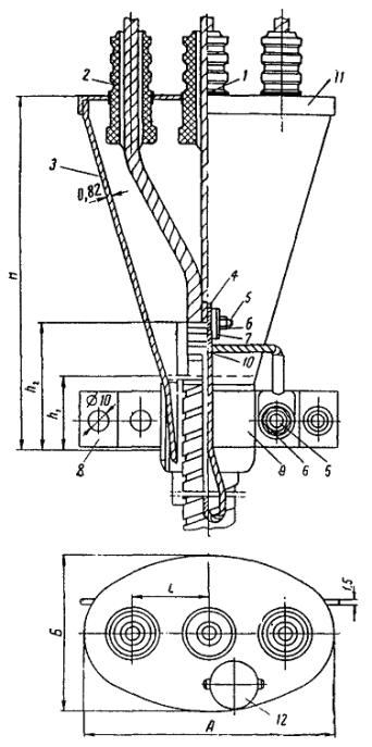 Рис. 90. Концевая овальная воронка: 1 - обмотка тафтяной лентой с подклейкой эпоксидным компаундом, полихлорвиниловой лентой или лентой из лакоткани; 2 - фарфоровая втулка; 3 - корпус воронки; 4 - стальная заземляющая скоба; 5 - болт М8; 6 - гайка М8; 7 - стальная шайба; 8 - полухомутик нижний из тонкой листовой стали; 9 - то же верхний; 10 - заземляющий медный провод; 11 - стальная крышка воронки; 12 - стальная крышка заливочного отверстия Рис. 91. Концевая круглая воронка 5.3.89. При заделке конца кабеля в воронке (рис. 90 и 91 и табл. 23 - 26) ее предварительно протирают чистой тряпкой без ворсин внутри и снаружи, надевают на кабель ниже места разделки и разделывают конец (рис. 92). Жилы кабеля обматывают тафтяной лентой с подклейкой эпоксидным компаундом, полихлорвиниловой лентой или лентой из лакоткани. Рис. 92. Размеры разделки конца силового кабеля для заделки его в воронке: 1 - броня кабеля; 2 - оболочка; 3 - поясная изоляция; 4 - изолированные жилы кабеля; 5 - уровень края воронки; 6 - голая жила Примерив место установки воронки, дополнительно наматывают просмоленную ленту в количестве, необходимом для создания надежного уплотнения при насадке воронки; воронку насаживают, надевают на концы жил фарфоровые втулки, намотав под них предварительно кабельную бумагу, надевают крышку и заливают кабельную массу. После остывания дополнительно доливают кабельную массу до краев воронки и закрывают заливочное отверстие. Таблица 23 Основные размеры овальных воронок для кабелей напряжением 3; 6 и 10 кв