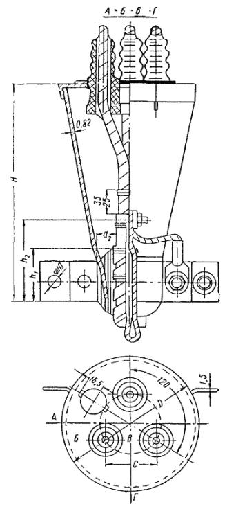 Примечание. Кабели напряжением 1 кв трехжильные сечением свыше 150 мм2, четырехжильные сечением свыше 120 мм2 монтируют в круглых воронках нормального габарита без крышек и втулок. Таблица 25 Размеры разделки кабелей напряжением 3; 6 и 10 кв в овальной воронке