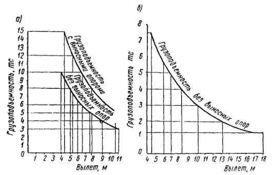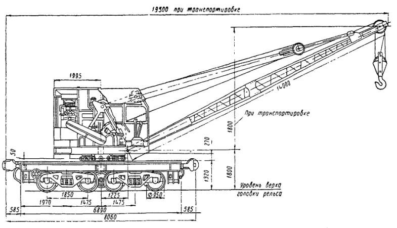 Рис. 1. Краны, рекомендуемые к применению при электрификации железных дорог Рис. 2. Кран МК-ЦУМЗ-15 2. Кран МК-15 Кран МК-15 (рис. 2 и 3) с двигателем внутреннего сгорания ЗИЛ-164 имеет грузоподъемность 15 т и является самоходным полноповоротным краном, перемещающимся по железнодорожному пути нормальной колеи. Кран оснащен стрелой длиной 14 м и может работать с крюком и грейфером. Стрела крана может быть удлинена до 18 м путем использования специальной вставки. При работе крана на выносных опорах со стрелой 14 м его грузоподъемность изменяется от 5 до 15 тс и при работе без выносных опор со стрелой 14 м - от 3 до 10 тс и со стрелой 18 м - от 1,3 до 7,5 тс. Кран вписывается в железнодорожный габарит № 1В (ОСТ ВКС 6435), после снятия поручней - в габарит № 0. Рис. 3. Диаграммы грузоподъемности крана МК-15: а - со стрелой длиной 14 м; б - со стрелой длиной 18 м Основные эксплуатационно-технические данные крана: Время подъема стрелы................................................................................... 52 сек Скорость передвижения крана при помощи собственного двигателя... 11,6 км/ч Путевые показатели Минимальный радиус закругления пути, необходимый для движения крана при помощи собственного двигателя 50 м Минимальный радиус закругления пути, необходимый для движения крана в составе поезда............................ 120 м Тяговое усилие на автосцепе, создаваемое двигателем крана, при крутизне подъема пути 9 %о......................................... 900 кг Предельно возможный подъем пути при передвижении собственным двигателем.......................................................................... 25 %о Скорость следования в составе поезда в транспортном состоянии (ходовые шестерни расцеплены).......... не более 60 км/ч Скорость следования с локомотивом с нерасцепленными ходовыми шестернями..................................... не более 15 км/ч Вес крана в рабочем состоянии.................................................................... 55,5 т Ширина кузова крана..................................................................................... 3,07 м Полная длина крана........................................................................................ 19,5 м 3. Кран КДВ-15 Основные размеры Вылет платформы крана от оси вращения (с автосцепкой)................... 4190 мм Вылет платформы крана от оси крашения (без автосцепки)................... 3440 » Ширина кузова крана от оси вращения...................................................... 3070 » Радиус вращения задней стенки кузова...................................................... 3300 » Вылет опоры стрелы..................................................................................... 1225 » Вылет стрелы в транспортном состоянии................................................ 15100 » Полная длина крана в транспортном состоянии...................................... 19500 » Высота поворотной части крана над уровнем рельса............................... 1430 » Вылет поджимных домкратов выносных опор от оси пути..................... 2200 » База крана...................................................................................................... 2950 » Высота крана над уровнем рельса.............................................................. 4500 » Путевые показатели Тяговое усилие на автосцепке крана при подъеме, равном 9 %о............. 900 кг Минимальный радиус закругления при передвижении самоходом........... 50 м Минимальный радиус закругления пути при транспортировке в составе поезда............................................................................................... 120 м Наибольший преодолеваемый уклон пути без груза................................... 25 %о Допускаемая скорость движения крана в рабочем состоянии с отдельным локомотивом............................................................................ 20 км/ч Характеристика двигателя Тип двигателя.....................................