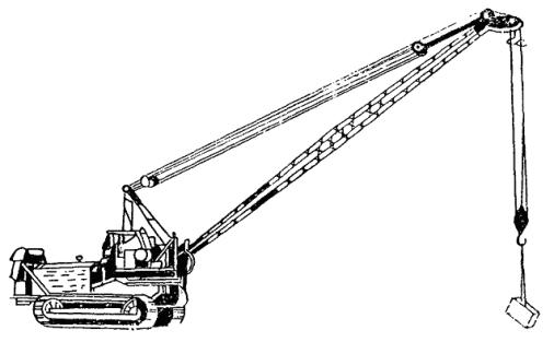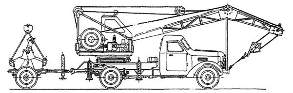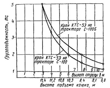 Скорость подъема груза.............................................................................. 6,4 м/мин Скорость передвижения крана............................................................. 2,36 - 10,15 км/ч Число оборотов поворотной части в минуту................................................... 1 Время полного изменения вылета стрелы................................................... 45 сек Коэффициент устойчивости наименьший..................................................... 1,16 Число электродвигателей.................................................................................. 3 Общая мощность............................................................................................. 10 квт Характеристика генератора: тип............................................................................................................ СГТ-25/6 мощность.............................................................................................. 25 ква/20 квт напряжение................................................................................................. 380 в число оборотов в минуту............................................................................ 1000 Габаритные размеры крана (в транспортном положении): длина........................................................................................................ 13500 мм ширина........................................................................................................ 3025 » высота......................................................................................................... 3200 » Вес.................................................................................................................... 21,5 т Тип крана........................................................................... стреловой с индивидуальным электроприводом механизмов Рис. 6. Диаграмма грузоподъемности крана КТС-5Э Кран смонтирован на тракторе С-100 с уширенными гусеницами (720 мм). Привод механизмов подъема стрелы груза и поворота крана - электрический. Питание электродвигателей производится от собственного генератора СГТ-25/6 мощностью 20 квт; возможно питание от внешней сети. Управление краном - кнопочное (из кабины) или дистанционное на расстояние до 10 м. Кран работает без выносных опор. 5. Кран ТКЭ-58 (рис. 7) Кран - дизель-электрический. Оборудование смонтировано на тракторе С-100. Дизельный двигатель трактора КДМ-100 приводит в действие синхронный генератор СГТ-25/6 мощностью 25 ква, вырабатывающий ток напряжением 380 в, 50 пер/сек. Управление краном кнопочное. Выносных опор кран не имеет. Техническая характеристика Вылет стрелы, м 2,3 3 4 5 6 8 Грузоподъемность, тс 5 4,5 3,2 2,6 2 1,5 Наибольшая высота подъема груза........................................................ 11 м Скорости: подъема груза............................................................................... 6,4 м / мин поворота........................................................................................ 1,0 об/мин передвижения........................................................................... 2,25 - 9,65 км/ч Мощность электродвигателей: подъема груза..................................................................................... 5 квт подъема стрелы................................................................................... 2,8 » поворота крана.................................................................................... 1,7 » Вес незаправленной машины.............................................................. 19520 кг Габаритные размеры в транспортном положении: длина..................................................................................................... 12000 мм ширина.................................................................................................... 2760 » высота...................................................................................................... 3600 » Рис. 7. Диаграмма грузоподъемности и схема крана ТКЭ-58 6. Краны АК-5Г (рис. 8) и АК-51 Рис. 8. Кран АК-5Г Грузоподъемность и высота подъема крюка крана АК-5Г: