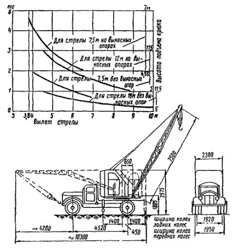 Размеры в транспортном положении крана АК-51: длина................................................................................................. 8800 мм ширина............................................................................................... 2340 » высота................................................................................................. 3450 » Колесная база......................................................................................... 1000 » Ширина колеи: передних колес.................................................................................. 1700 » задних »........................................................................................ 1740 » Общий вес.............................................................................................. 8550 кг Марка шасси......................................................................................... ЗИЛ-164 Скорость движения своим ходом........................................................ 45 км/ч 7. Автомобильный кран К-51 (рис. 9) Рис. 9. Диаграмма грузоподъемности и схема крана К-51 8. Кран К-104 Кран К-104 (рис. 10) грузоподъемностью 10 тс является тяжелым полууниверсальным автомобильным краном. Он установлен на автомобиле ЯАЗ-210, оснащен стрелой длиной 10 м и может работать с крюком или грейфером. Стрела крана может быть удлинена до 18 м путем использования специальной вставки. Рис. 10. Кран К-104 При работе крана на выносных опорах со стрелой 10 м его грузоподъемность изменяется от 2,2 до 10 тс, со стрелой 18 м - от 0,75 до 6 тс. При работе без выносных опор со стрелой 10 м грузоподъемность изменяется от 1 до 4 тс и со стрелой 18 м - от 0,25 до 1,5 тс. При работе с грейфером на средних вылетах стрелы грузоподъемность крана составляет 3,5 тс. Скорость движения крана своим ходом: по асфальтированному шоссе - до 35 км/ч, по проселочным дорогам - до 20 км/ч. Кран может передвигаться также с грузом до 3 т, висящим на нормальной стреле при вылете 4 м; скорость движения при этом не должна превышать 5 км/ч. Техническая характеристика Марка шасси......................................................................................... ЯАЗ-210 Габаритные размеры (в транспортном положении): длина................................................................................................ 14300 мм ширина............................................................................................... 2750 » высота................................................................................................. 3910 » Ширина колеи: передних колес................................................................................ 1950 мм задних колес...................................................................................... 1920 » Общий вес крана................................................................................... 22800 кг Величины скоростей: подъема груза весом 10 т................................................................ 3,5 - 9 м/мин вращения поворотной части.......................................................... 0,5 - 1,5 об/мин подъема груза на малом крюке...................................................... 4,5 - 15 м/мин подъема грейфера................................................................................ 27 м/мин подъема груза весом 6 т при стреле длиной 18 м....................... 5 - 12,5 м/мин передвижения крана с грузом............................................................ 2 - 5 км/ч Грузоподъемность крана К-104: а) При стреле длиной 10 м