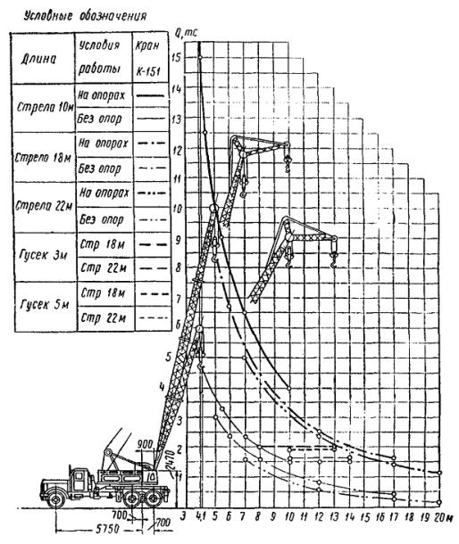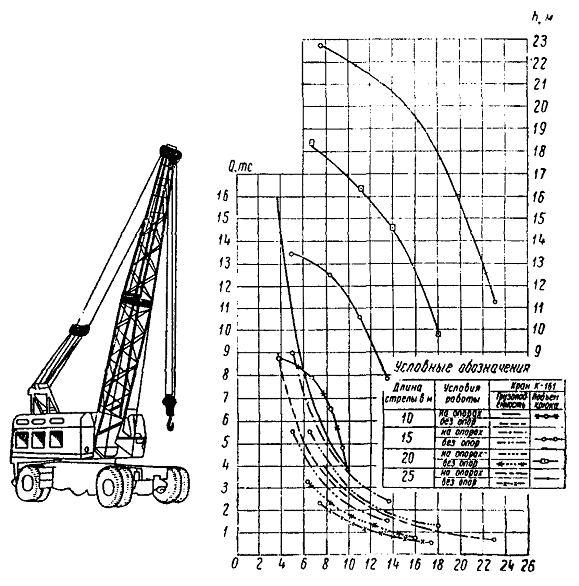 9. Кран K-151 (рис. 11) Автомобильный дизель-электрический кран К-151 грузоподъемностью 15 тс является полноповоротным; в зависимости от перерабатываемых грузов он может работать на выносных опорах или без них. Длина стрелы крана 10 м. При помощи вставки длиной 8 или 12 м стрела может быть удлинена до 18 или 22 м. Дизель-электрический кран К-151 смонтирован на шасси автомобиля ЯАЗ-219, имеющем двухтактный шестицилиндровый дизель ЯАЗ-М206А мощностью 180 л.с. Электрическая установка крана - трехфазного тока напряжением 400 в с питанием от собственного генератора MCA 73/4A мощностью 30 ква или от внешней сети переменного тока напряжением 380 в. Все рабочие механизмы имеют индивидуальный электропривод с механической передачей на рабочие органы. Техническая характеристика крана Режим работы крана............................................................................ средний Максимальная грузоподъемность крана: основного подъема............................................................................ 15 тс вспомогательного подъема................................................................. 2 » Высота подъема крюка: при стреле 10 м................................................................................... 9,1 м при стреле 18 м.................................................................................. 16,1 » при стреле 18 м с гуськом................................................................ 17,2 » при стреле 22 м.................................................................................. 19,5 » при стреле 22 м с гуськом................................................................ 20,5 » Скорость подъема крюка: при стреле 10 м............................................................................. 3 - 8 м/мин при стреле 18 м........................................................................... 4 - 12,5 м/мин при стреле 22 м............................................................................... 4 - 12,5 » Скорость подъема груза на малом крюке....................................... 2 - 11 м/мин Максимальная скорость передвижения крана (при стреле 10 м, установленной вдоль продольной оси крана): по асфальтовому шоссе.................................................................... 35 км/ч по проселочным дорогам с грузом 2 т........................................... 5 км/ч Скорость вращения поворотной части......................................... 0,5 - 1,5 об/мин Вес крана со стрелой 10 м................................................................... 20800 кг Габаритные размеры: продольная база шасси.................................................................... 5750 мм высота в транспортном положении................................................ 3910 » общая длина в транспортном положении со стрелой 10 м......... 14000 » наибольшая ширина в транспортном положении......................... 2740 » Рис. 11. Диаграмма грузоподъемности и схема крана К-151 10. Кран K-161 (рис. 12) Самоходный полноповоротный дизельный на пневмоколесном ходу. Наибольшая грузоподъемность крана при работе со стрелой 10 м (при вылете 3,75 м) составляет 16 тс. Кран оборудован стрелой 10 м, которая с помощью вставок может увеличиваться до 15; 20 и 25 м. Для подъема грузов больших габаритов весом до 2 т все стрелы крана снабжены надставкой длиной 6 м и вспомогательным крюком. Возможна одновременная работа двумя крюками. Кран может передвигаться с поднятым грузом. Наличие в трансмиссии крана турботрансформатора обеспечивает плавное бесступенчатое регулирование рабочих скоростей всех крановых механизмов, плавный подъем и опускание, а также получение минимальных посадочных скоростей груза. Кинематическая схема крана допускает совмещение основных крановых операций. Наличие переднего и заднего ведущих мостов автомобильного типа создает высокую проходимость крана по дорогам с различным покрытием. Управление разворотом колес и механизмами 
