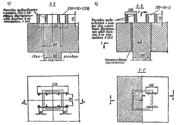 Рис. 1. Детали соединения свай с ростверком: а - вариант № 1; б - вариант № 2 4. Выбор свай для промежуточных и анкерных опор при погружении в однородные грунты