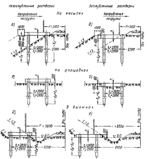6. Опоры на свайных фундаментах (рис. 2) Рис. 2. Схема установки опор на свайные фундаменты: а, в, д - ростверки над грунтом; б, г, е - ростверки на грунте Приложение 7БЛОЧНЫЕ ФУНДАМЕНТЫ СТАНЦИОННЫХ ОПОР ГИБКИХ ПОПЕРЕЧИН И ИНЖЕНЕРНО-ГЕОЛОГИЧЕСКИЕ ДАННЫЕ1. Характеристика блоков типа Р (рис. 1 и 2)