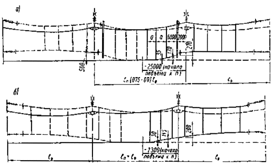 компенсированной подвески: Рис. 2. Схема переходного пролета цепной подвески с одним контактным проводом. а) - при сопряжении с секционированием, б) - при сопряжении без секцинонирования; а - расстояние между струнами; lо - длина промежуточного пролета; lп - длина переходного пролета
