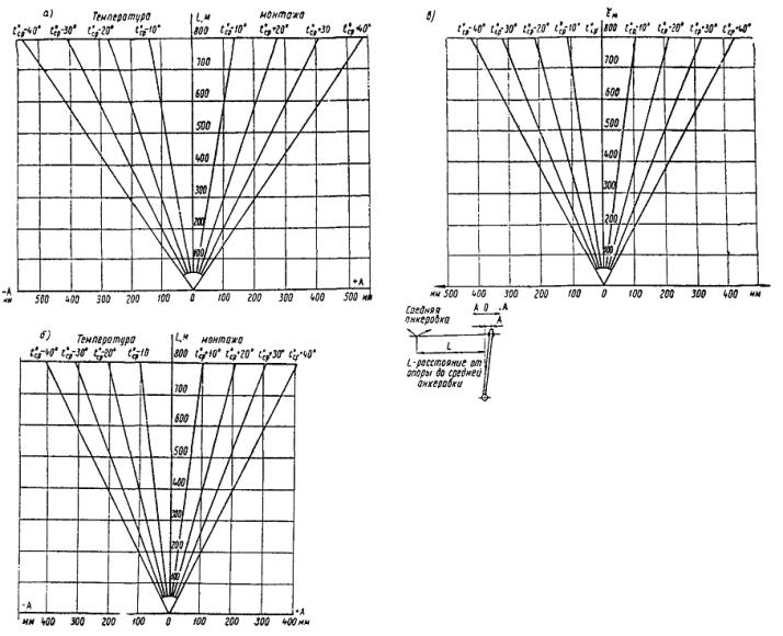 Рис. 3. Перемещения фиксаторов и консолей в компенсированных подвесках: а - при медных контактных проводах и медном несущем тросе (постоянный ток); б - при сталемедном несущем тросе (постоянный ток); в - в подвеске переменного тока с несущим тросом ПБСМ-70; L - расстояние от средней анкеровки, м; А - величина перемещения, мм; tср - средняя температура;