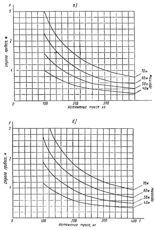 Рис. 4. Кривые зависимости стрел провеса от натяжения троса группового заземления (40, 50, 60 и 70 м - длины мачтовых пролетов): а - для троса ПБСМ-60; б - для тросов ПБСМ-70 и С-70