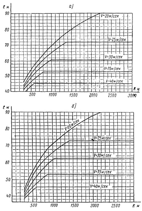 3. Минимальные длины переходных пролетов lп на кривых при наибольших скоростях (рис. 2)