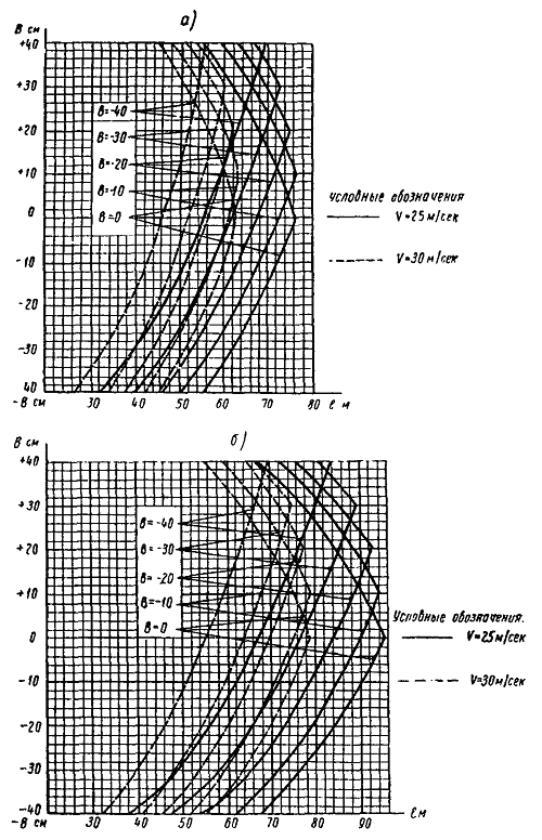 Рис. 6. Длины пролетов цепной подвески на прямой в зависимости от зигзагов: а - цепная подвеска с одним контактным проводом МФ-100 (гирлянда из 3-х изоляторов); б - цепная подвеска с двойным контактным проводом 2МФ-100; b - величина зигзага, см; l - длина пролетов, м