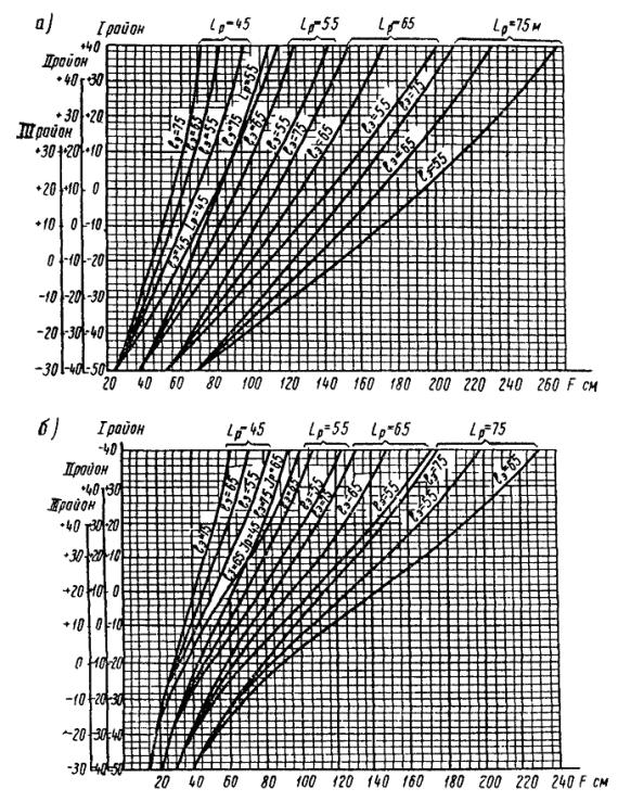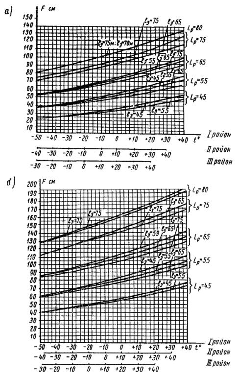 Рис. 8. Кривые зависимости стрел провеса провода А-185 от температуры и длины эквивалентных пролетов lэ: а - при натяжении в проводе 500 кг; б - при натяжении в проводе 900 кг; F - стрела провеса, см; Lр - длина рабочего пролета, м