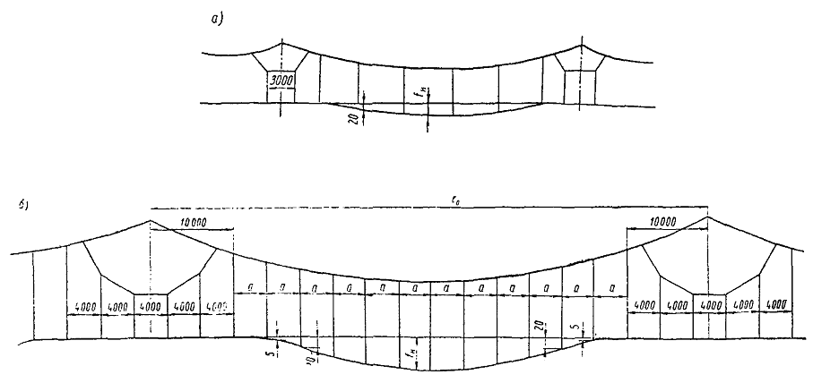 Рис. 9. Схема провеса контактных проводов в промежуточном пролете: а) - компенсированной подвески ПБСМ70 + 1МФ-100; б) - компенсированных подвесок М120 + 2МФ-100; М95 + 2МФ-100; ПБСМ95 + 2МФ-100 постоянного тока; а - расстояние между струнами, м; fн - стрела провеса контактного провода в середине пролета, мм (см. табл. 10)