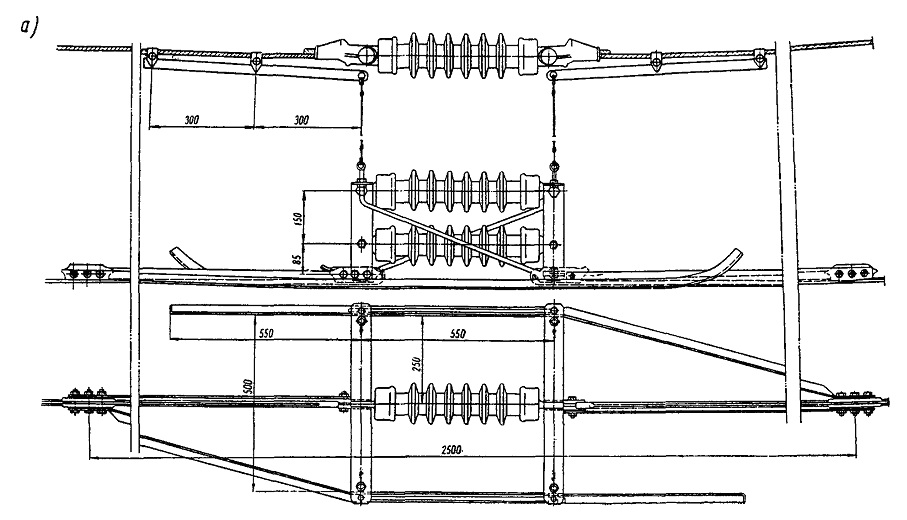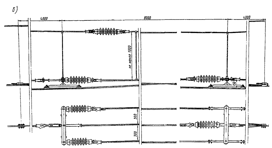 где C - величина смещения центра пантографа внутрь кривой; h - возвышение наружного рельса, см; Н - высота контактного провода от головки рельса, см; k - ширина колеи, мм. 4.6.10. Регулировка контактной подвески на перегонах заканчивается монтажом и регулировкой сопряжений анкерных участков. До начала монтажа и регулировки сопряжений необходимо, чтобы на прилегающих к сопряжению анкерных участках была выполнена регулировка, а несущий трос на переходных и анкерных опорах переведен в седла. Кроме этого, должны быть установлены фиксаторные кронштейны (или фиксаторные стойки), у опор разложены фиксаторы и, при необходимости, заготовлен и доставлен на место дополнительный трос. производят постановку струновых зажимов на контактные провода и черновую регулировку подвески; монтируют фиксаторы, регулируют зигзаги; осуществляют регулировку контактных проводов по высоте, а также их выправку и выкрутку; производят монтаж электрических соединителей. Примечание. Для обеспечения плавки гололеда токами короткого замыкания, если это предусмотрено проектом, на сопряжениях в струны переходного пролета врезают антенные изоляторы и монтируют переходное электросоединение с одной рабочей ветви контактной подвески на другую. 4.6.12. Ветви компенсированной подвески сопряжений анкерных участков подвешивают на траверсе в двух точках; при этом рабочую ветвь подвешивают на ролике, а ветвь, отходящую на анкеровку, - в седло. У переходных опор нерабочую ветвь устанавливают выше рабочей на 200 мм. Снижение должно быть плавное. Начало подъема нерабочей ветви контактного провода осуществляется на расстоянии 23 м от переходной опоры, в сторону середины переходного пролета (для прямых участков пути). 4.6.13. Монтаж вспомогательного троса производится в следующем порядке: заготовленный трос раскатывают между анкерными опорами и устанавливают на нем струновые зажимы со струнами; подвешивают вспомогательный трос; вытягивают трос, согласно монтажным таблицам, и анкеруют его; закрепляют вспомогательный трос плашками, а около опор с помощью соединительных зажимов крепят к основному тросу. После монтажа вспомогательного троса и раскатки контактного провода производятся работы согласно п. 4.6.11. Анкеруемые ветви контактного провода подвешивают от середины переходного пролета до анкерной опоры к вспомогательному тросу. 4.6.14. Монтаж сопряжения анкерных участков с секционированием полукомпенсированной цепной подвески ведется в следующем порядке: выполняется черновая регулировка с установлением проектного расстояния между ветвями цепных подвесок; врезают изоляторы в несущие тросы и контактные провода; устанавливают струновые зажимы на контактные провода; монтируют фиксаторы с установкой контактных проводов в проектное положение в плане; регулируют контактные провода; монтируют и подсоединяют шлейфы секционного разъединителя к контактной сети и к самому разъединителю (при этом контактные поверхности проводов, тросов и соединительных зажимов в местах крепления соединителей должны быть тщательно очищены от окиси и пыли). При компенсированной подвеске на участках с одним контактным проводом около врезных изоляторов монтируют коромысла, соединяющие несущий трос и контактный провод отходящих анкерных ветвей (рис. 42). 4.6.15. Изоляторы на сопряжениях анкерны