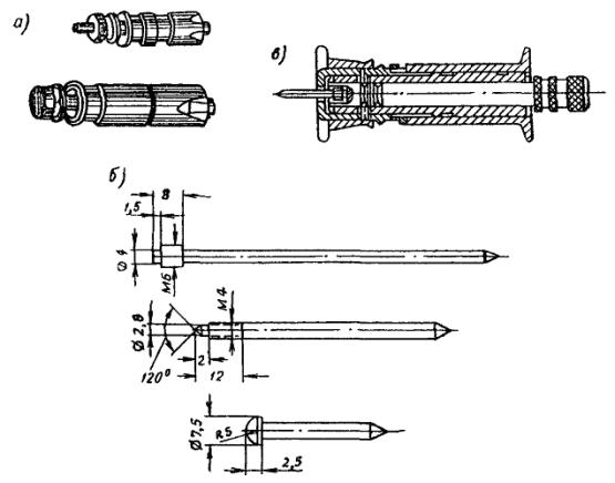 Дюбеля забивают следующим образом: нажав рукой на защелку, расположенную с левой стороны пистолета, открывают его; в ствол пистолета вводят дюбель с надетым на него полиэтиленовым наконечником; вставляют надлежащего размера патрон и закрывают пистолет резким поворотом ствола (глубину забивки дюбеля регулируют также установкой ограничительной шайбы), берут пистолет обеими руками: левой за кожух ствола и правой за рукоятку, большим пальцем левой руки нажимают на предохранительную кнопку, пистолет с силой прижимают к строительной конструкции, нажимая одновременно правой рукой на рукоятку, спусковым крючком производят выстрел. Выстрел разрешается производить только в защитных очках. Рис. 3. Дюбель: а - общий вид; б - шпилька, болт и винт; в - продольный разрез Для работы с пистолетом рабочий должен быть специально обучен и иметь удостоверение, получаемое после сдачи испытания квалификационной комиссии. Крепление с помощью дюбелей, так называемое безвмазочное, осуществляется следующим образом: подготавливают отверстия по диаметру и глубине, соответствующие размерам применяемых дюбелей, и в них ударами молотка забивают дюбеля так, чтобы их наружные торцы были в одной плоскости с краями отверстий. Затем винт, болт или шпильку пропускают через деталь крепления устанавливаемого изделия и ввинчивают в распорную гайку дюбеля до отказа. Распорная гайка, перемещаясь в корпусе дюбеля, раздвигает его лепестки, вдавливая их в стенки гнезда, и создает, таким образом, самозаклинивание дюбеля в отверстии (рис. 3). Дюбеля выпускаются различных размеров. Ниже приводятся типоразмеры дюбелей, выпускаемых Московским заводом электромонтажных инструментов треста «Электромонтажконструкция» (табл. 3). Помимо этого, можно использовать простые дюбеля типов Д6 и Д4 с наружной резьбой М6 и М4 и дюбеля в виде гвоздей с круглой шляпкой типа Г4, которые забиваются в опорную поверхность с помощью специальных оправок типа ОД-6, ОД-4 и ОГ-4. Таблица 3 Характеристика дюбелей с распорной гайкой