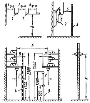 Элементы закрытого РУ для иллюстрации наименьших допустимых расстояний в свету: 1 - шины; 2 - выключатель; 3 - сплошные ограждения; 4 - сетчатое ограждение; 5 - барьер; А, Б, В, Г, Д, Ж - изоляционные расстояния