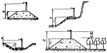 Примечания: 1. Сооружение считается расположенным в местности данного типа, если эта местность сохраняется на расстоянии: для местности по п. 2-250 м; по п. 3 - 200 м, по п. 4 - 100 м, по п. 5 - 50 м, по п. 6 - 50 м. 2. Для местности по пп. 1 - 4 дано наименьшее значение параметра шероховатости для условий режима максимального ветра с учетом наличия снегового покрова. Эти же значения параметра шероховатости принимают и при гололеде. 3. Значение параметра шероховатости по п. 5 дано для случая, когда станционные постройки расположены с обеих сторон железнодорожного пути не далее 50 м. В противном случае его значение принимают для местности, лежащей с наветренной стороны станционных построек 4. В случаях, когда местность не подходит под приведенную выше классификацию, можно принимать промежуточное значение параметра шероховатости. 5. Для участков контактной сети, проходящих по берегу озера, водоема, моря, если с другой его стороны расположена отвесная стена гор, параметр шероховатости следует принимать по п. 2. Высоту расположения проводов контактной сети над подстилающей поверхностью для участков железной дороги с различным профилем следует определять в соответствии со схемами рис. 2. Для участков, расположенных в выемке глубиной 7 м и более, высоту z над подстилающей поверхностью следует принимать равной 3 м. 6. При расположении железнодорожной насыпи на местности с параметром шероховатости 0,5 и 1 м высота расположения проводов контактной сети уменьшается на высоту препятствия, т.е. становится равной (z - 10) м. При этом значение параметра шероховатости подстилающей поверхности принимают равным 0,15 м по п. 5 и 0,2 м - п. 6.