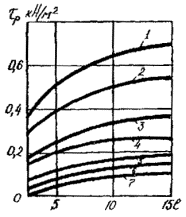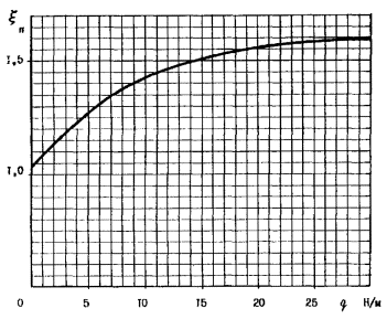 Рис. 3. Коэффициент пульсаций давления ветра 2.15. При наличии многолетних (не менее 20 лет) данных местных гидрометеостанций о скоростях ветра допускается определять нормативное ветровое давление по выражению: qo = 0,0615v2о, где vо - скорость ветра на уровне 10 м над поверхностью земли, соответствующая десятиминутному интервалу осреднения и превышаемая в среднем в 10 лет, м/с 2.16. Нормативное значение пульсационной составляющей ветровой нагрузки, передаваемой с проводов на опорные, поддерживающие и фиксирующие устройства Qпн H, находят по формуле: Qпн = 0,73×Qсн×vп×mп×xп, (6) где xп - коэффициент динамичности, принимаемый по рис. 4 в зависимости от веса провода (проводов) (при гололеде вместе с весом отложения).