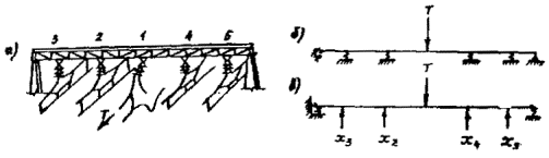 Рис. 13. Схема для расчета жесткой поперечины с учетом реакции тросов: а - общий вид; б - схема ригеля на упругих опорах; в - расчетная схема а)