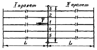 Рис. 4. Коэффициент динамичности для проводов контактной сети 2.17. При расчете ветровой нагрузки, передаваемой с проводов на опорные, поддерживающие и фиксирующие устройства контактной сети, следует принимать следующие коэффициенты надежности по ветровой нагрузке: а) при расчете по прочности - 1,3; б) при расчете по деформациям - 1,0; в) при расчете по образованию трещин в железобетонных опорах - 0,75. Расчетное значение ветровой нагрузки на опорные, поддерживающие и фиксирующие устройства следует определять как произведение нормативного значения на коэффициент надежности по ветровой нагрузке 1,2. Механический расчет проводов выполняют на нормативное значение средней составляющей ветровой нагрузки, принимая нормативное ветровое давление qo (п. 2.11), умноженное на коэффициент 1,10. 2.18. При определении ветровой нагрузки на провода и конструкции контактной сети значения аэродинамического коэффициента лобового сопротивления Сх принимать следующие: а) одиночные провода и тросы диаметром 20 мм и более - 1,10; б) то же диаметром менее 20 мм и также на провода и тросы, покрытые гололедом - 1,20; в) одиночные контактные провода и тросы цепной подвески с учетом зажимов и струн - 1,25; г) двойные контактные провода с расстоянием между ними 40 мм на нулевых местах и на насыпях высотой до 5 м от сопротивления единичного провода - 1,55, то же на насыпях более 5 м - 1,85; д) железобетонные опоры кольцевого и круглого сечения - 0,7; е) ригели жестких поперечин по пп. 2.19 - 2.22 данных Норм; ж) плоские элементы конструкций - 1,4. 2.19. Расчет ветровых нагрузок на ригели жестких поперечин следует выполнять в соответствии с рекомендациями СНиП 2.01.07-85 по нагрузкам и воздействиям и дополнительными рекомендациями пп. 2.20 - 2.22настоящих Норм. 2.20. Ветровые нагрузки на ригели жестких поперечин необходимо определять для отсека фермы и приводить затем к нагрузке на 1 м. За отсек принята часть фермы, заключенная между двумя поперечными сечениями на длине панели и характеризующаяся схемой решетки и геометрическими параметрами, которые повторяются по длине фермы (рис. 5). 2.21. Горизонтальную расчетную нагрузку на отсек ригеля х1 Н определяют при действии ветра вдоль пути: