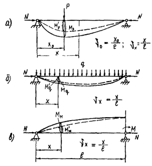 Рис. 15. Расчетные схемы определения изгибающих моментов и прогибов сжато-изогнутых стержней большой гибкости при нагружении: а - сосредоточенной силой (Мр