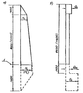 Рис. 16. Огибающие обобщенные эпюры для расчета железобетонных опор контактной сети: а - изгибающих моментов; б - перерезывающих сил (В скобках для опор 15,6 м); I - условный обрез фундамента