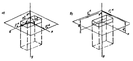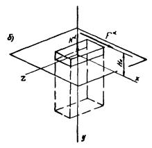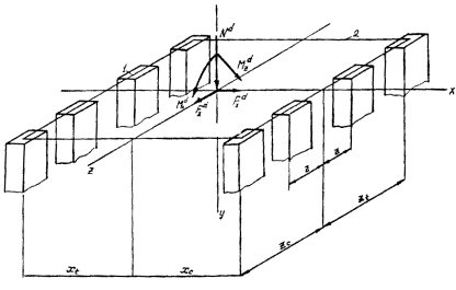 Рис. 18. Расчетные схемы нагрузок, действующих в двух плоскостях: а - вертикальная сила Nd - горизонтальные силы Fdx и Fdz, моменты Мdx и Мdz; б - вертикальная сила Nd и горизонтальные силы Fdx и Fdz - действующие соответственно на высоте Нх и Нz Сила Fd, действующая вдоль оси х, и момент Мdz относительно оси z могут быть заменены силой Fdх (той же величины), действующей параллельно оси х на высоте Нx от нее