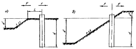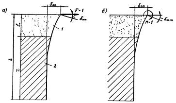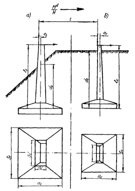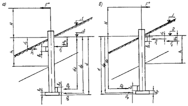 где Мо - значение расчетной несущей способности условного фундамента относительно расчетной поверхности грунта (п. 7.23); Н' - высота приложения равнодействующей горизонтальной нагрузки относительно уровня условного обреза фундамента; Н - то же относительно расчетной поверхности грунта (п. 7.5). 7.17. Значения коэффициента условий работы gcf принимают равными: а) для одиночных фундаментов без лежней при форме поперечного сечения в виде: прямоугольника - 1,0; круга или кольца - 0,9; двутавра - 1,1; трехлучевого - 0,9; в) для сдвоенных фундаментов, расположенных вдоль пути: при нагрузке, действующей вдоль оси пути - 1,1 (при ширине фундамента, равной размеру поперечного сечения фундамента, измеренного в направлении, перпендикулярном оси пути); при нагрузке, действующей поперек оси пути - 1,0 (при удвоенной ширине фундамента, равной размеру поперечного сечения сдвоенного фундамента между его наружными гранями, измеренного в направлении вдоль оси пути). 7.18. Значения коэффициента условий работы gco при нагрузке, действующей в плоскости, перпендикулярной бровке земляного полотна, определяют по следующим таблицам. При расположении фундамента на площадке (рис. 19, а) и нагрузке, действующей в сторону откоса, - по табл. 29, при нагрузке, действующей в сторону площадки, - по табл. 30. При расположении фундамента на откосе (см. рис. 19, б), при нагрузке, действующей в сторону откоса, - по табл. 31. при нагрузке, действующей в противоположную сторону, - по табл. 32. При определении gco конфигурацию грунта, отличающуюся от изображенной на схемах (см. рис. 19), следует приводить к этим схемам.